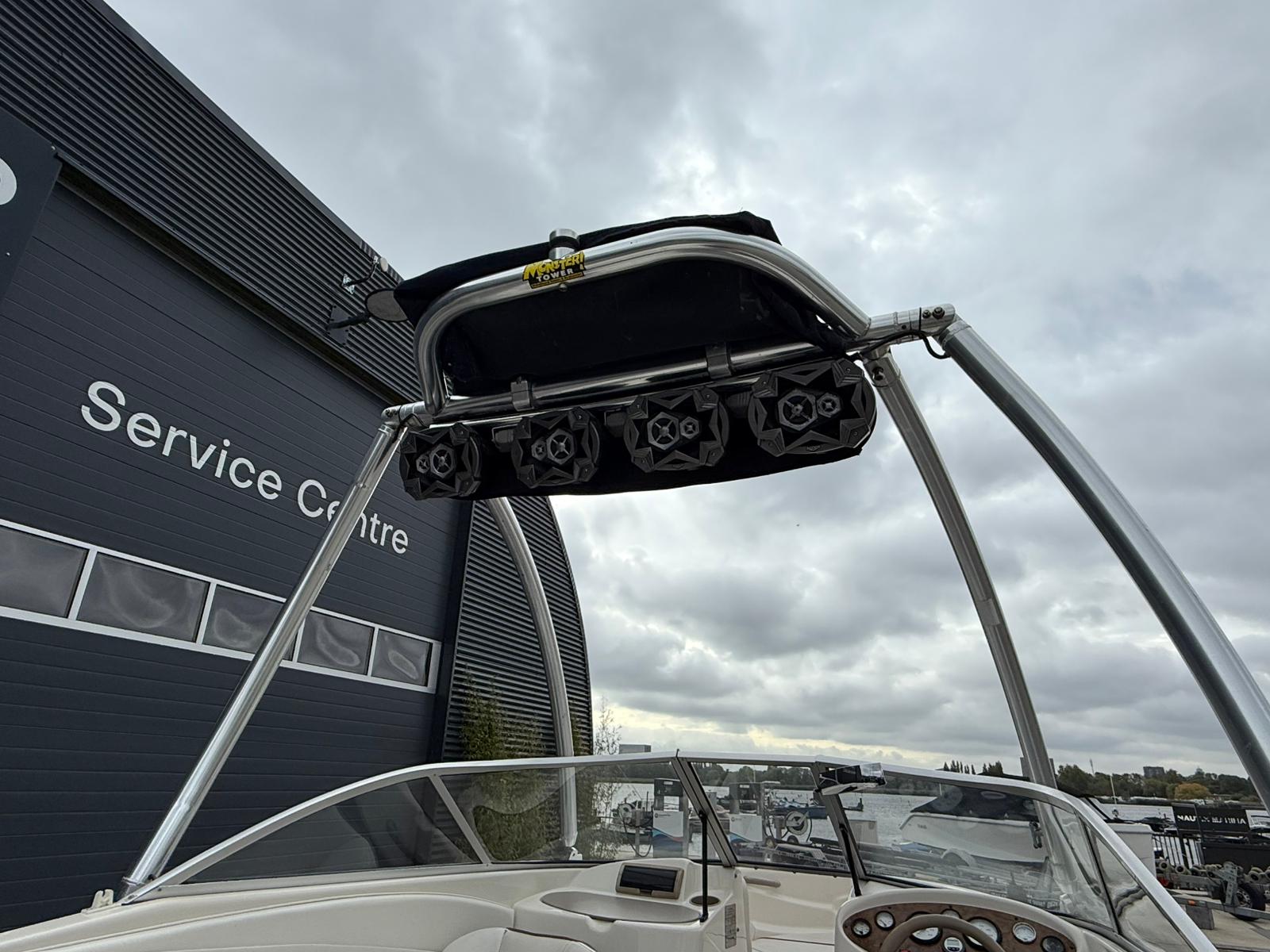 De boot is uitgerust met een wakeboardtoren met ingebouwde speakers, ideaal voor watersporters die graag actief het water op gaan. Achterop vind je een verlengd zwemplateau, wat het in- en uitstappen uit het water comfortabel en veilig maakt. Perfect voor zwemmen, wakeboarden of gewoon lekker relaxen in de zon.