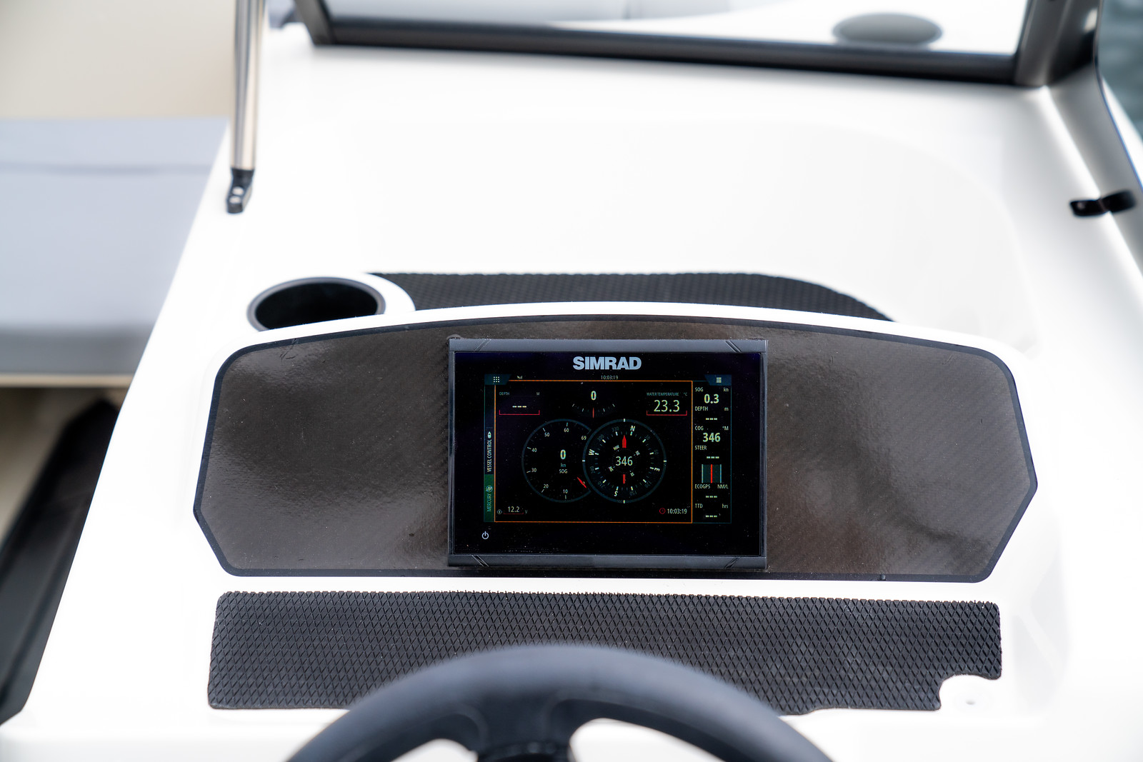 Royale cockpit met comfortabele banken en geïntegreerde bekerhouders