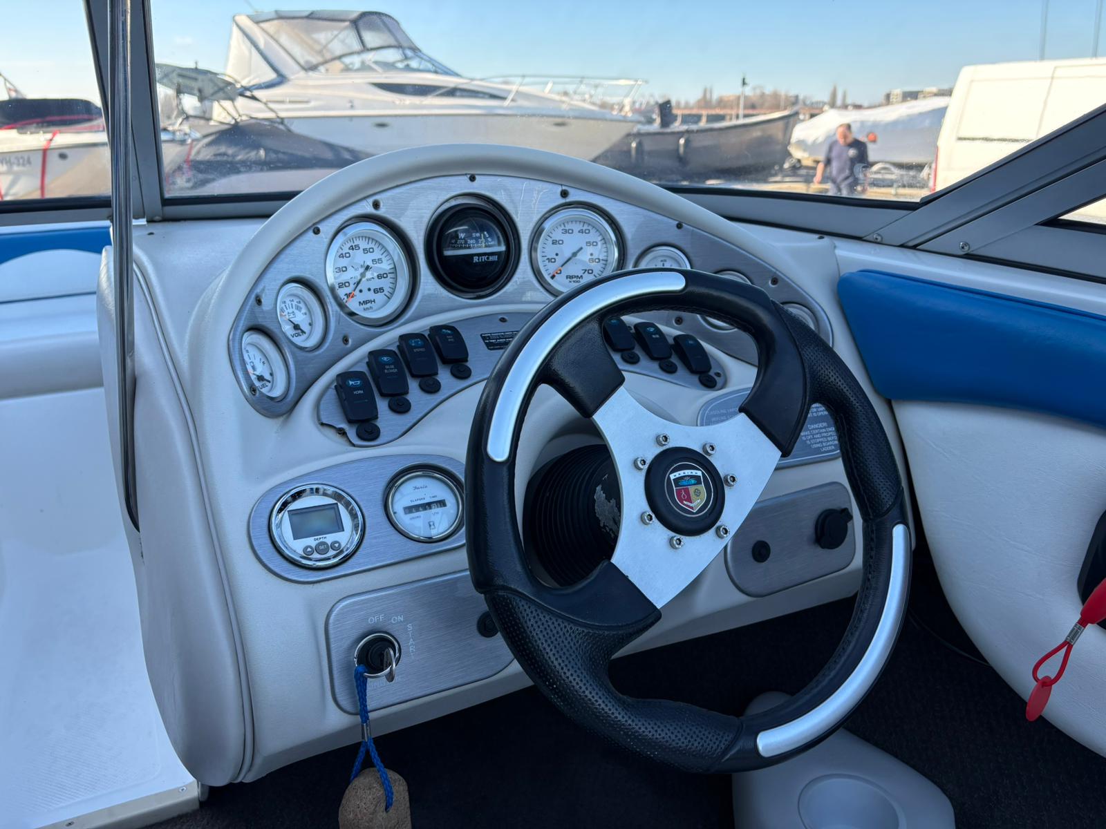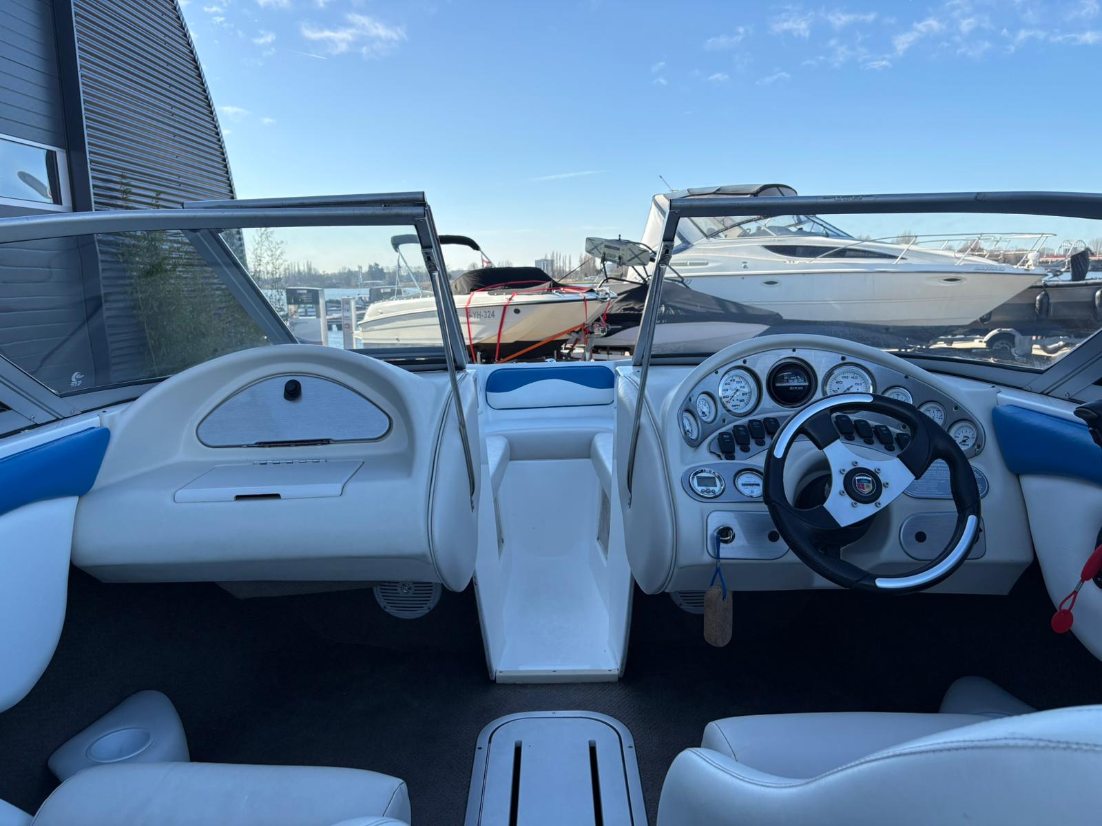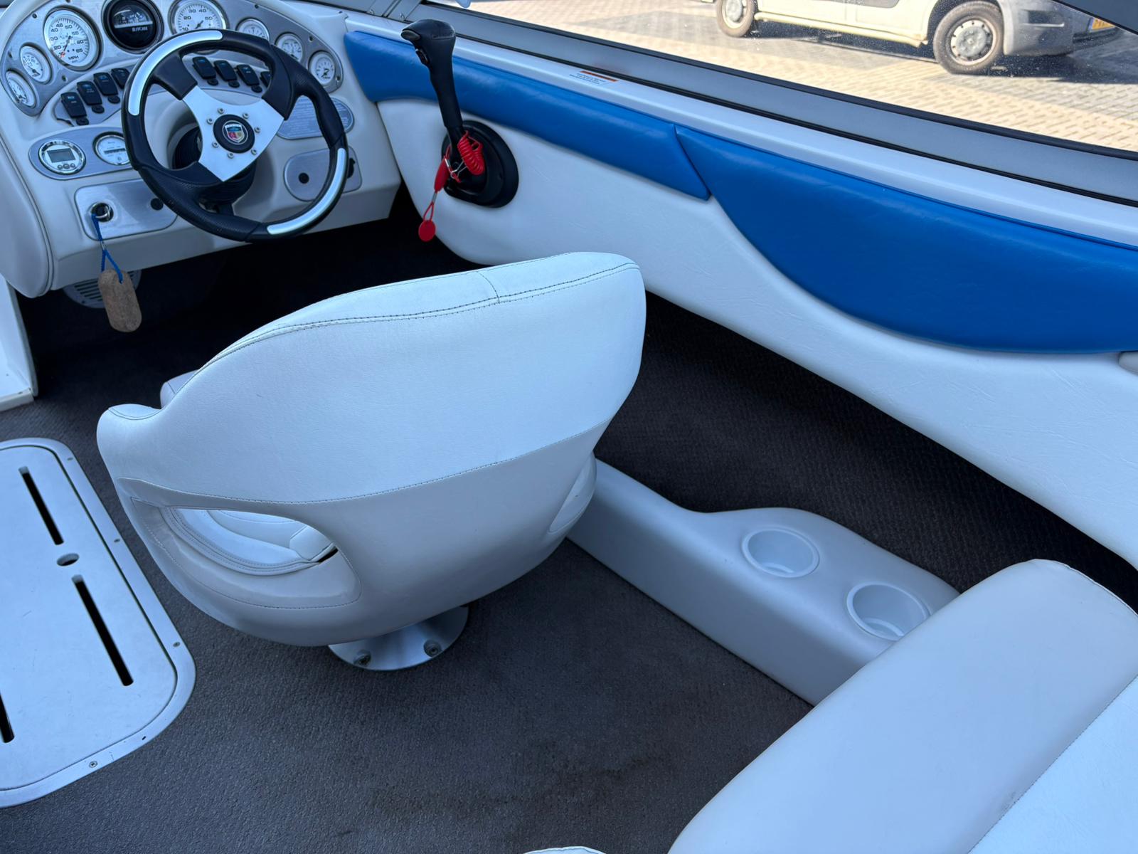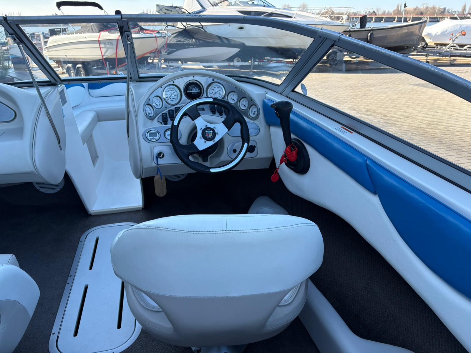 Aan boord valt direct de slimme indeling op. Het open boeggedeelte met comfortabele kussens nodigt uit tot ontspannen zitten in de zon. In de kuip zorgen de brede zitbanken en flip-up stoelen voor een prettige zitpositie, zowel tijdens het varen als wanneer u voor anker ligt. Het overzichtelijke dashboard met snelheidsmeter, toerenteller, kompas en brandstofmeter geeft u alle controle binnen handbereik, terwijl het sportstuurwiel de sportieve uitstraling compleet maakt.