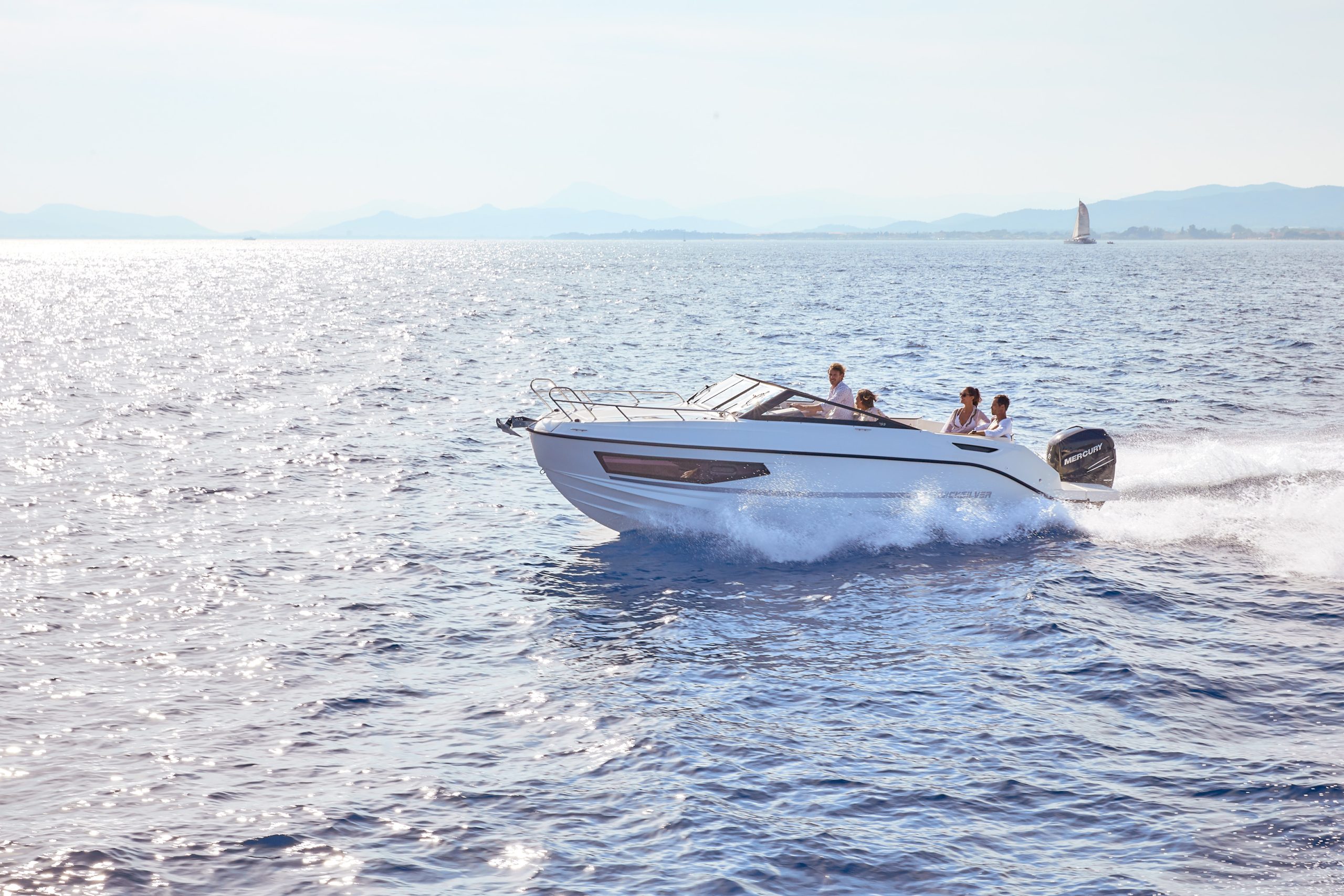 De 755 Cruiser staat garant voor veilige en wendbare navigatie, aangedreven door een krachtige Mercury buitenboordmotor tot 300 PK. De brede kuiptoegang, slim geplaatste handrails en ruime doorgang van boeg tot achterdek maken bewegen aan boord eenvoudig en veilig. Grote zwemplatforms bieden directe toegang tot het water. De diepe kuip en het hoge windscherm zorgen ervoor dat jong en oud zich comfortabel en beschermd voelen.