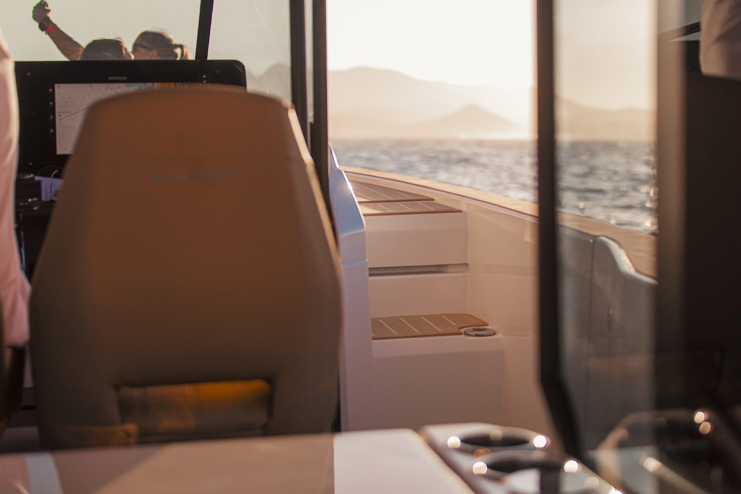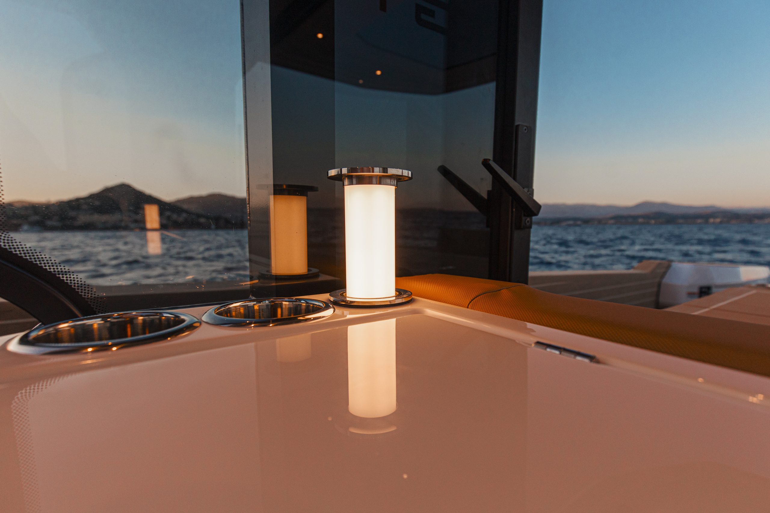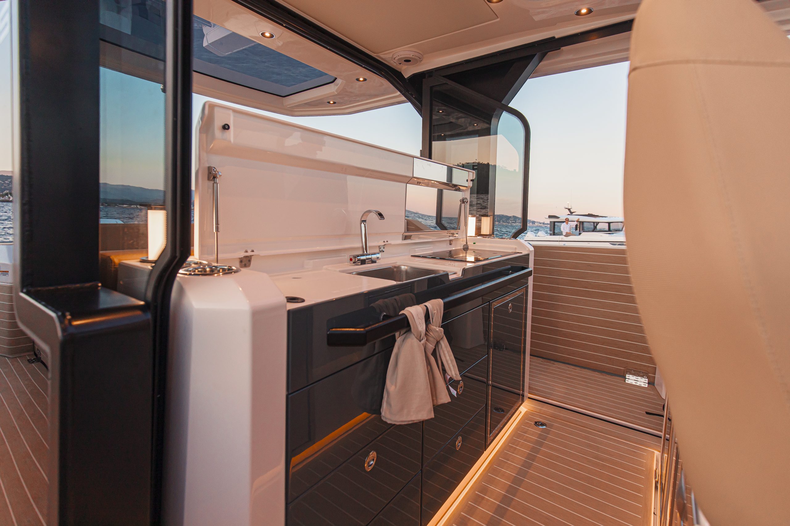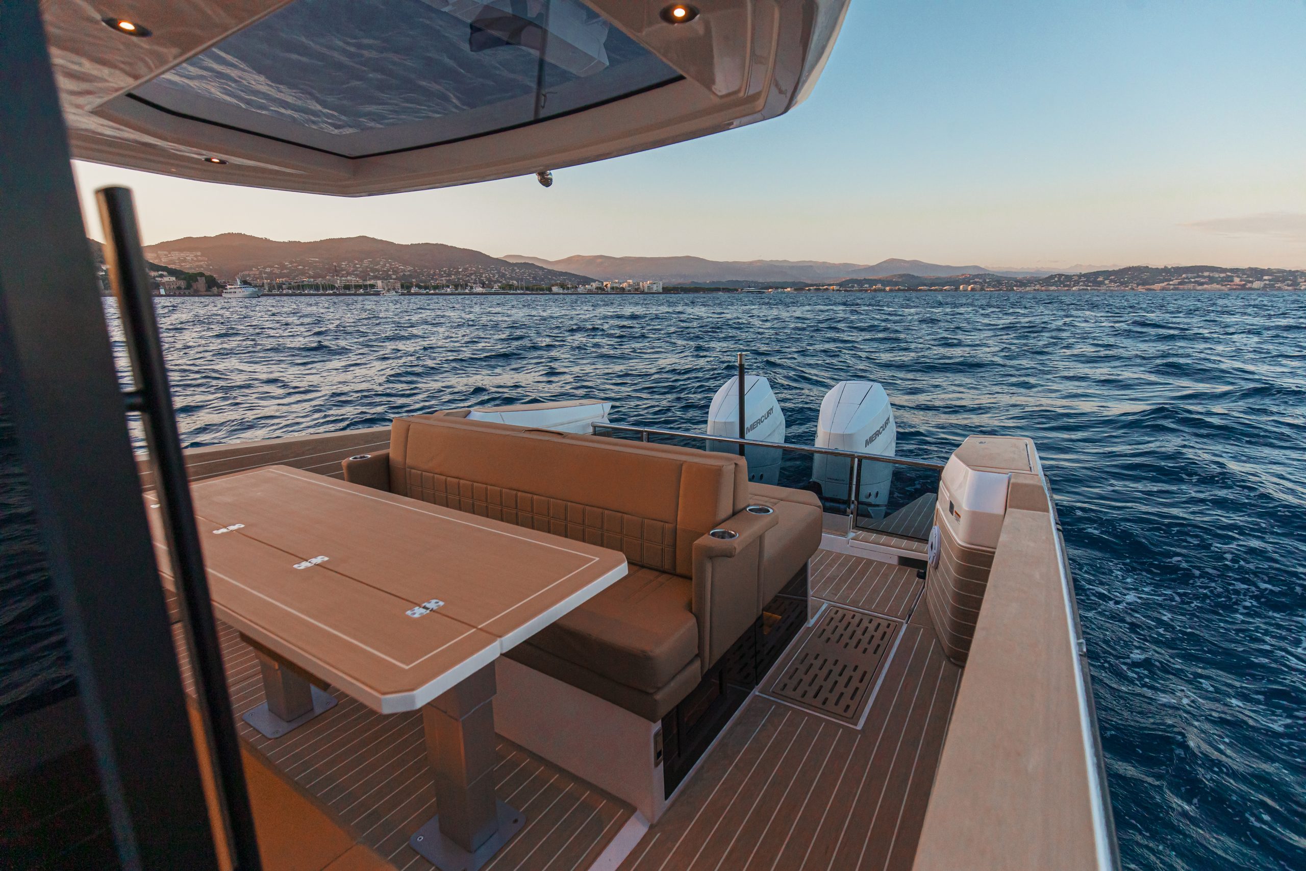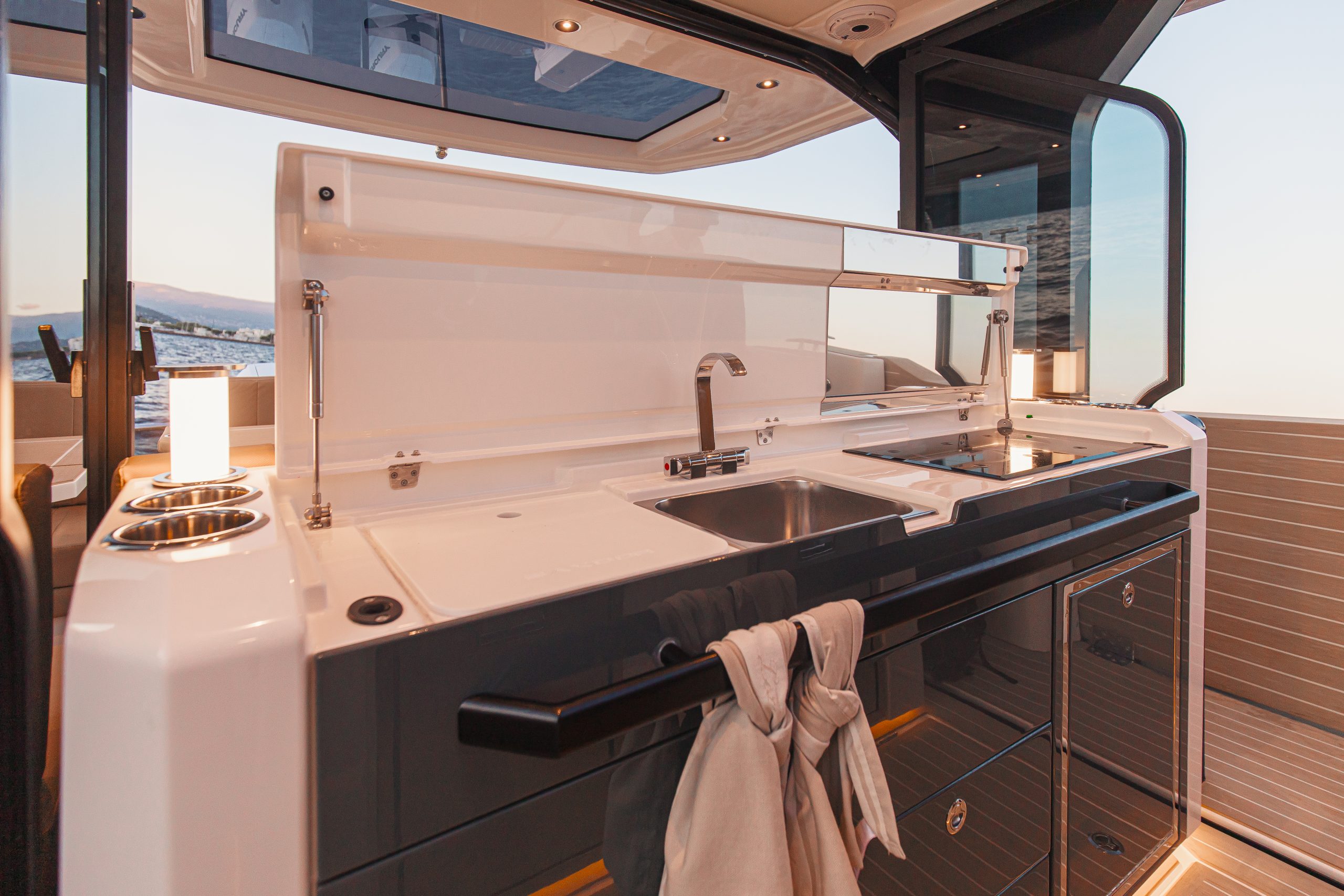Aan boord vind je slimme details die het leven op het water nóg aangenamer maken, zoals een ingebouwde grill en spoelbak om verse maaltijden te bereiden, en een elektrisch bedienbaar dak waarmee je met één druk op de knop schakelt tussen zon, schaduw of beschutting.