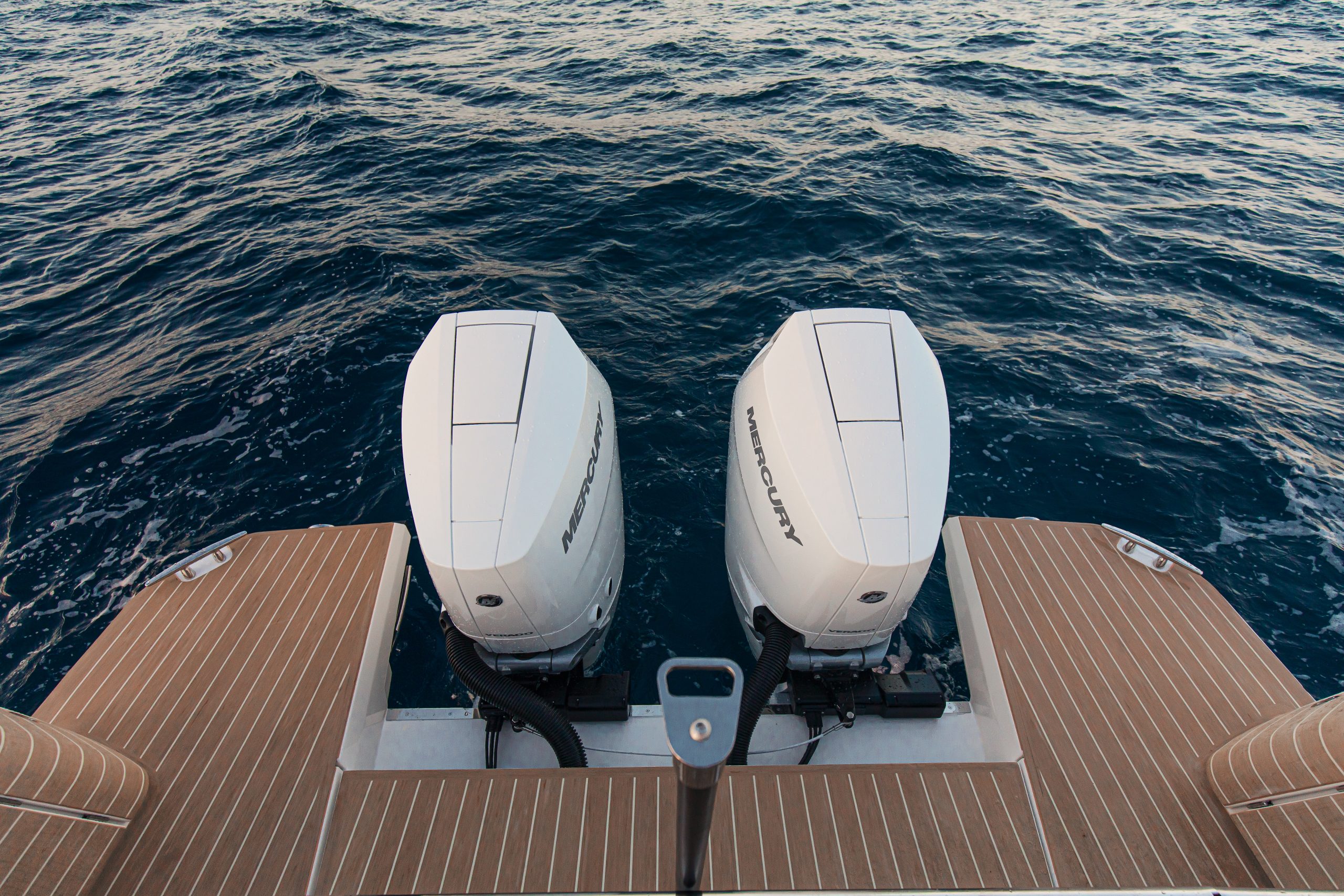 Onder de elegante lijnen schuilt het befaamde twin-stepped V21°-rompontwerp, licht en efficiënt dankzij de vacuümgeïnfuseerde constructie. Deze techniek zorgt voor een stijve, sterke maar vooral lichte romp die garant staat voor scherpe acceleratie, precieze besturing en een stabiele vaart. De dubbele buitenboordmotoren leveren indrukwekkende prestaties met soepele controle, zelfs bij hogere snelheden of ruwer water.