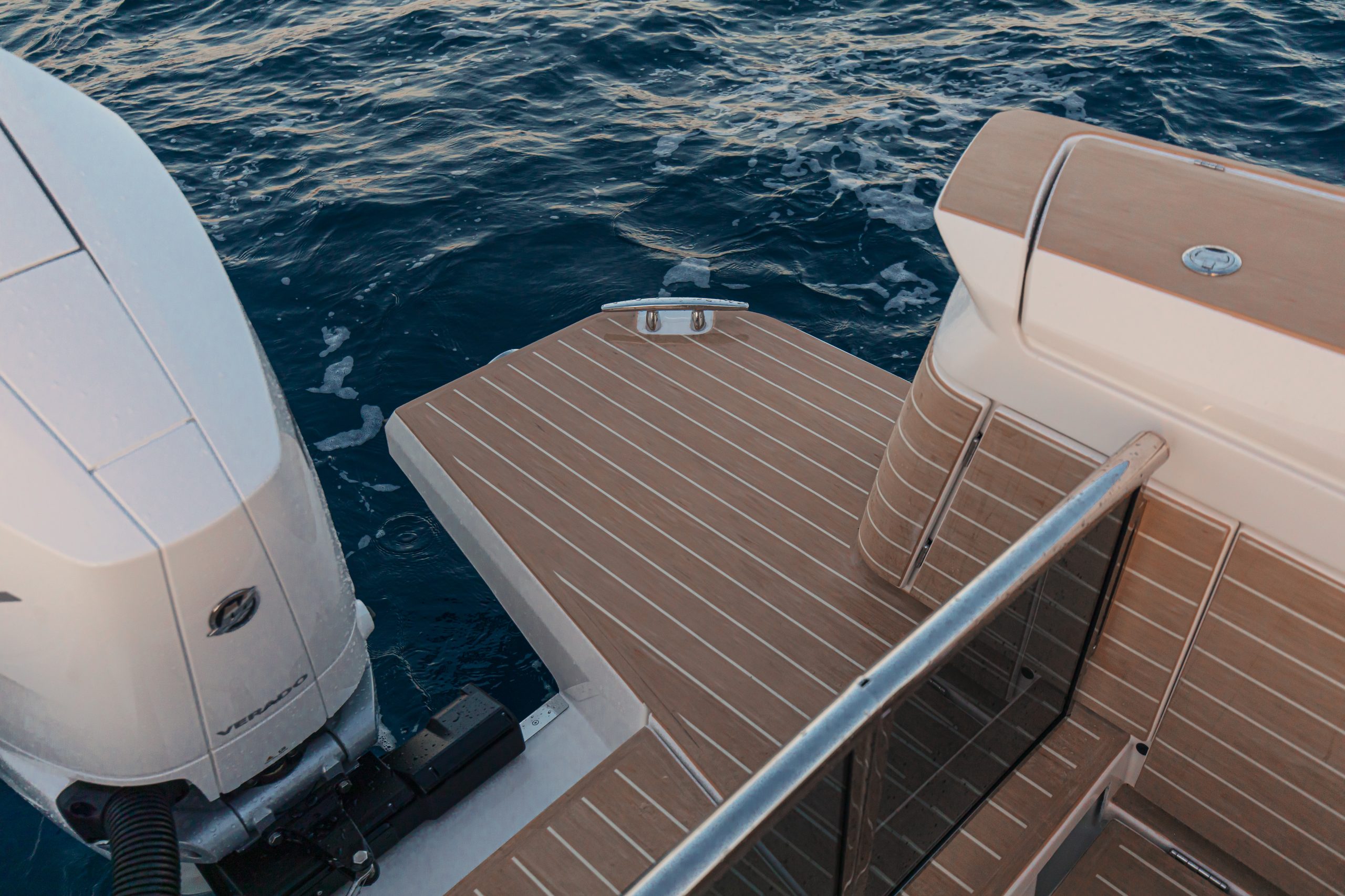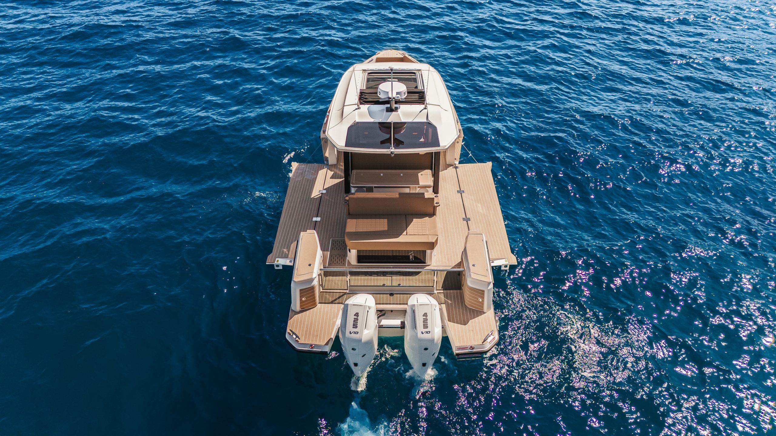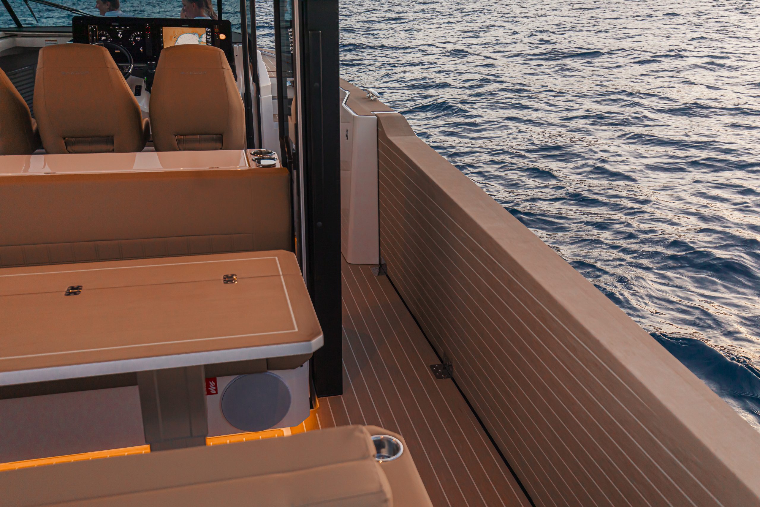 De open dekruimte nodigt uit om te bewegen: je loopt moeiteloos van boeg tot achterdek, en eenmaal voor anker zorgen de uitklapbare terrassen voor extra leefruimte op waterniveau. Deze functionaliteit maakt de boot niet alleen ruimer, maar ook intiemer – ideaal voor loungen, zwemmen of ontspannen borrelen bij zonsondergang.