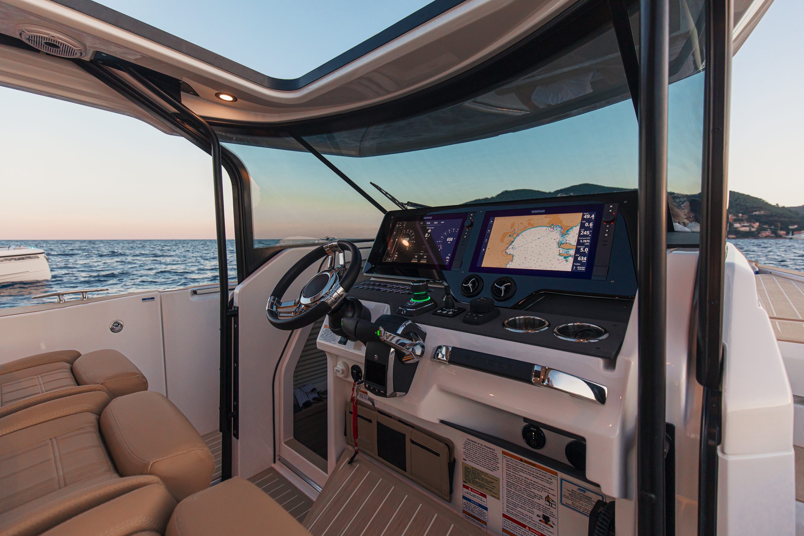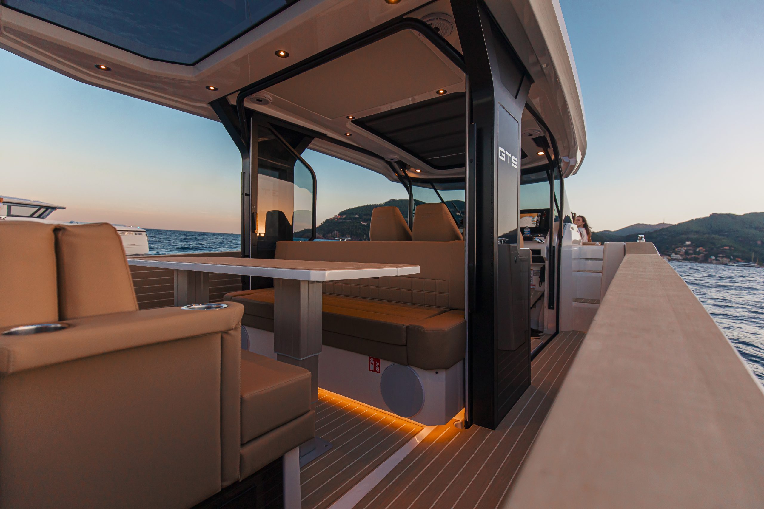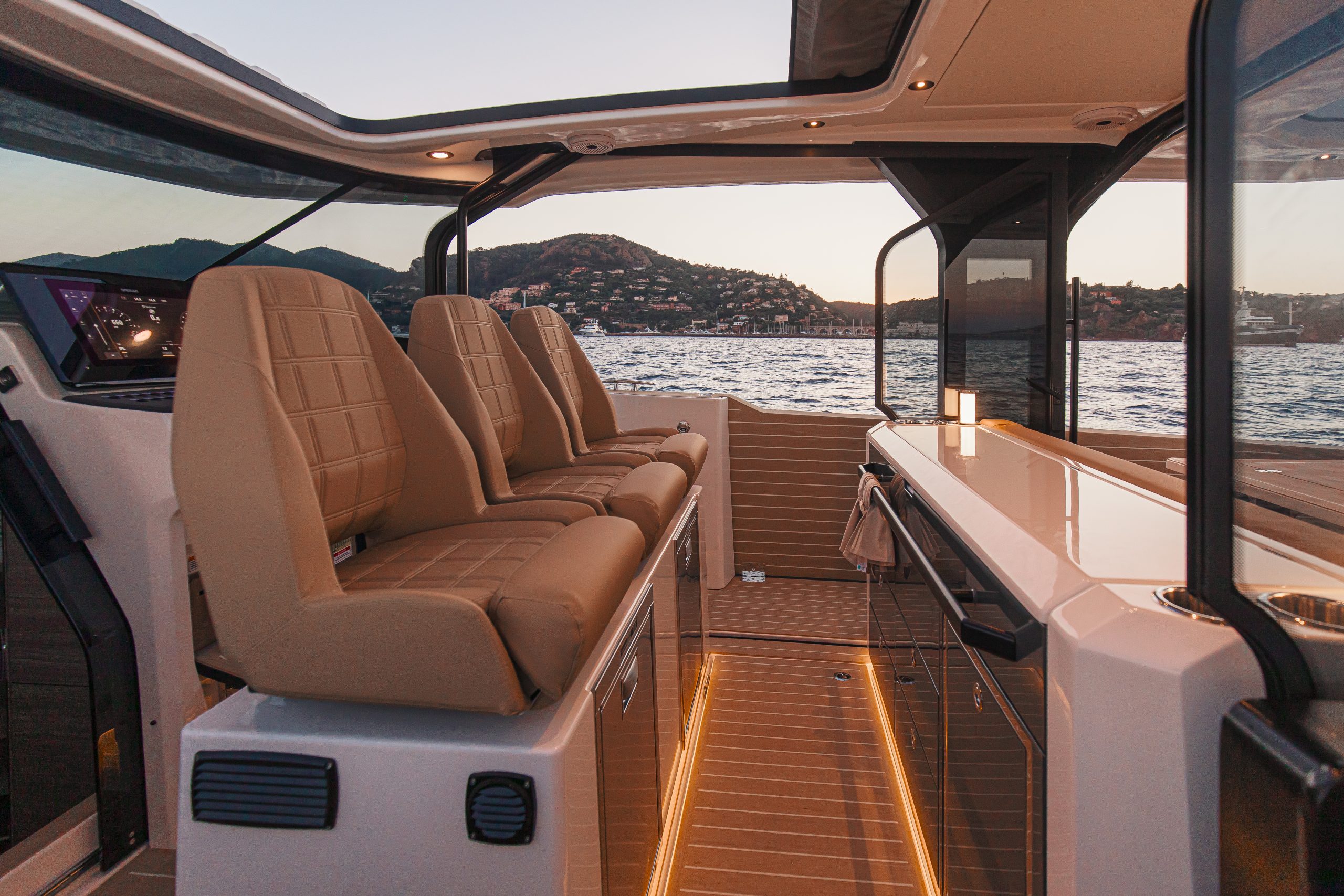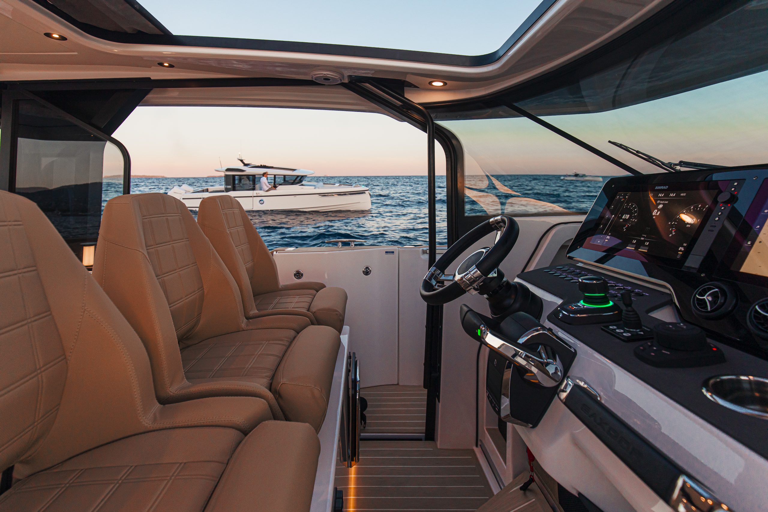 Aan het roer ervaar je direct waarom de 400 GTS een echte driver’s boat is. De ergonomische stuurpositie met brede zichtlijnen, comfortabele stoelen en intuïtieve bedieningselementen zorgt voor maximale controle en comfort, zelfs tijdens lange tochten. Het vernieuwde dashboard is overzichtelijk en modern, met zwevende dubbele displays en een minimalistisch design. De volledige voorruit sluit perfect aan op het dak en biedt uitstekende bescherming tegen wind en spray — zo blijf je gefocust op de koers, niet op de omstandigheden.