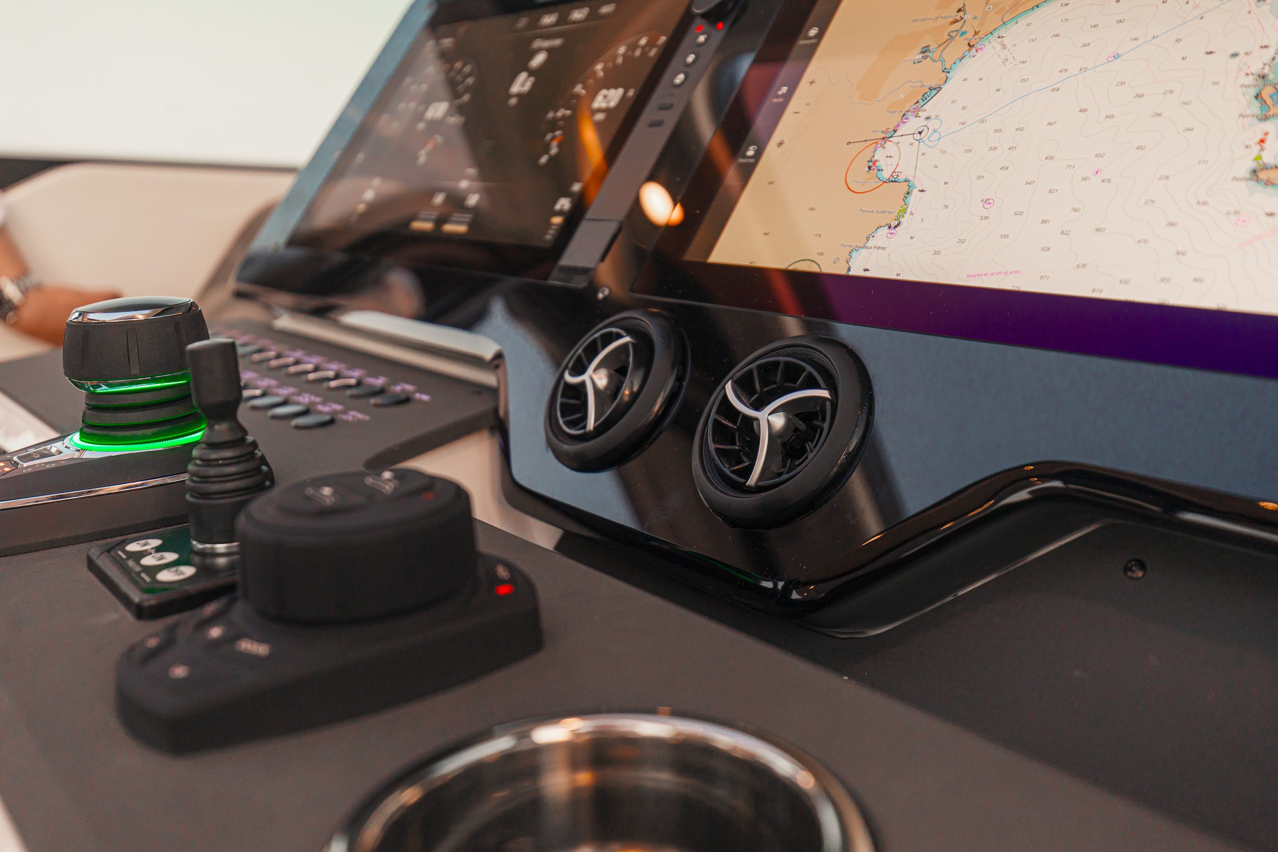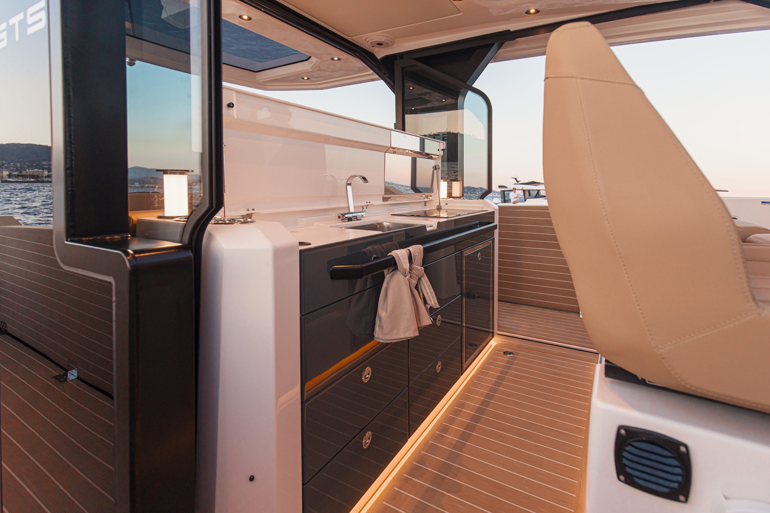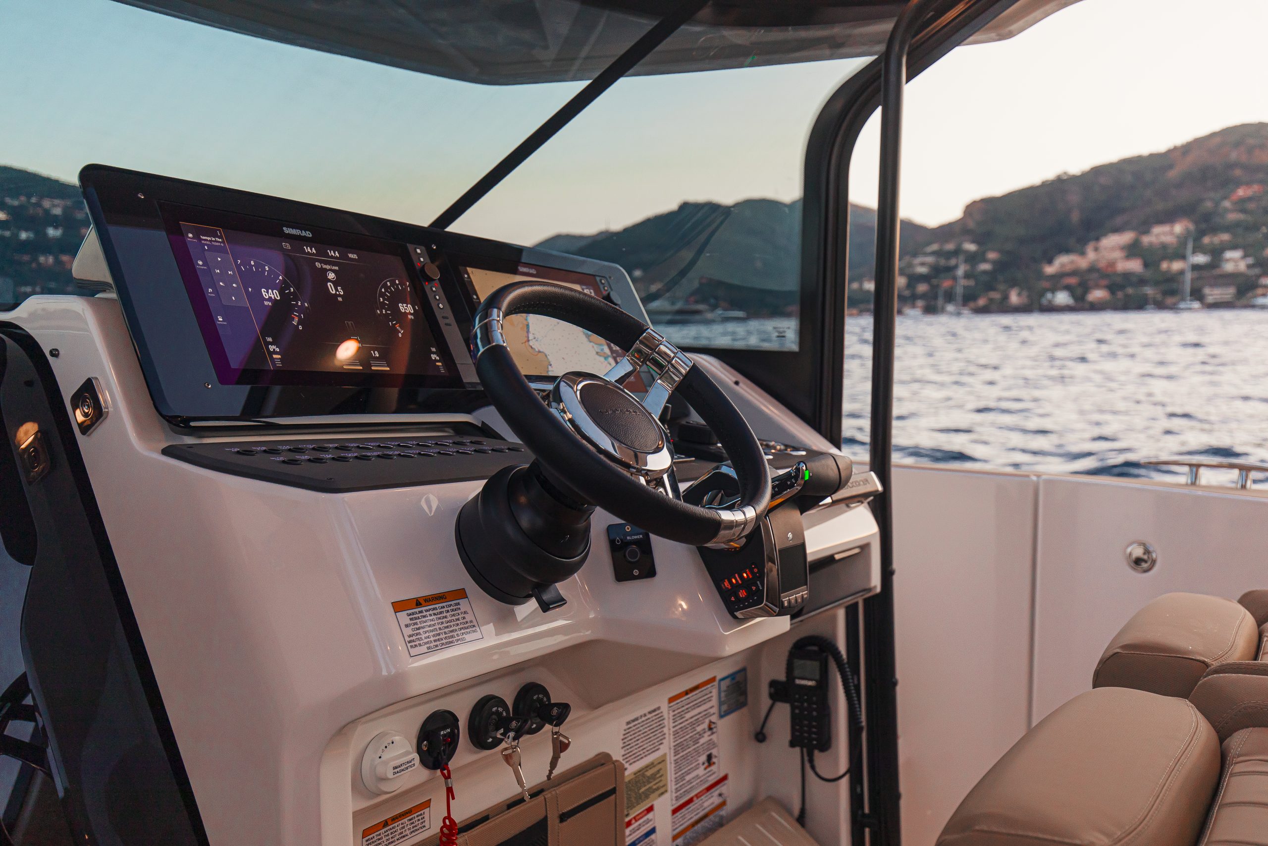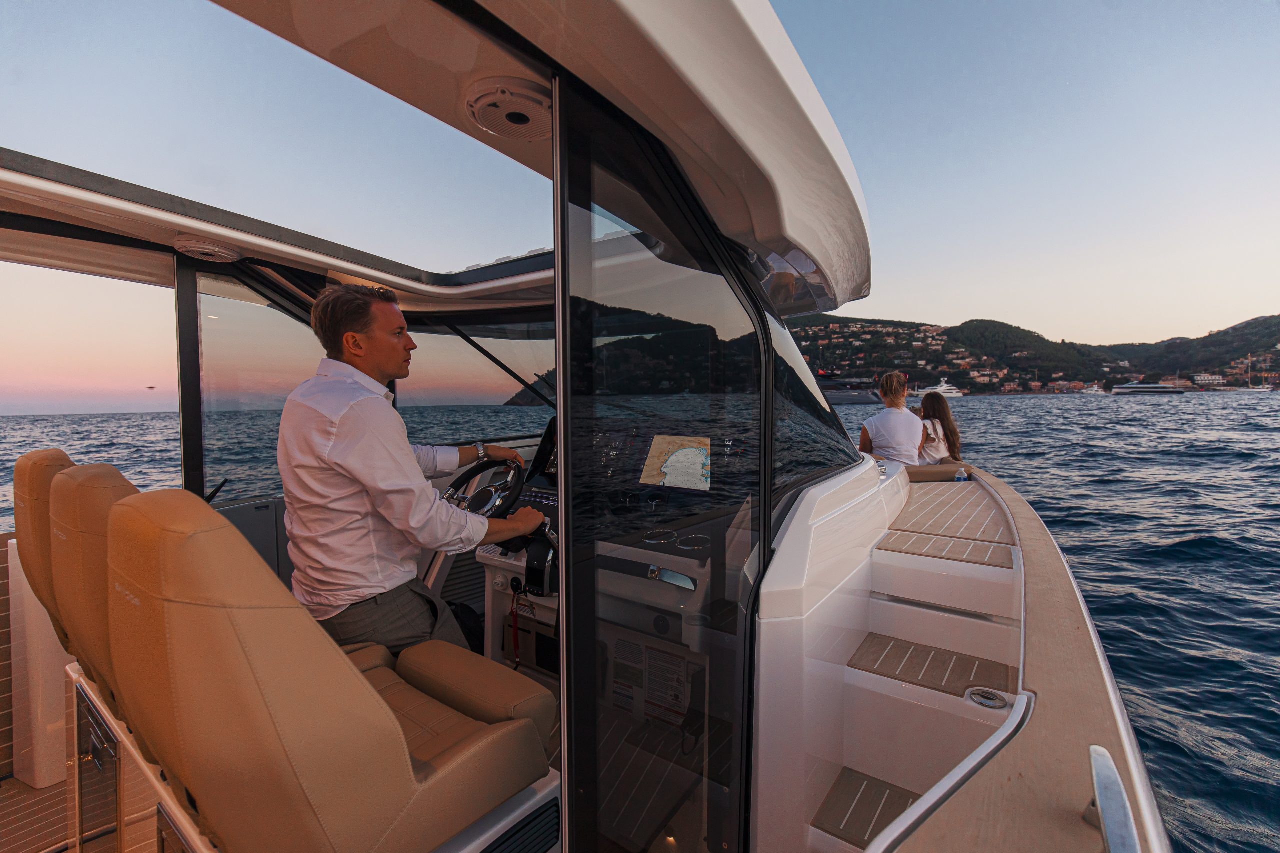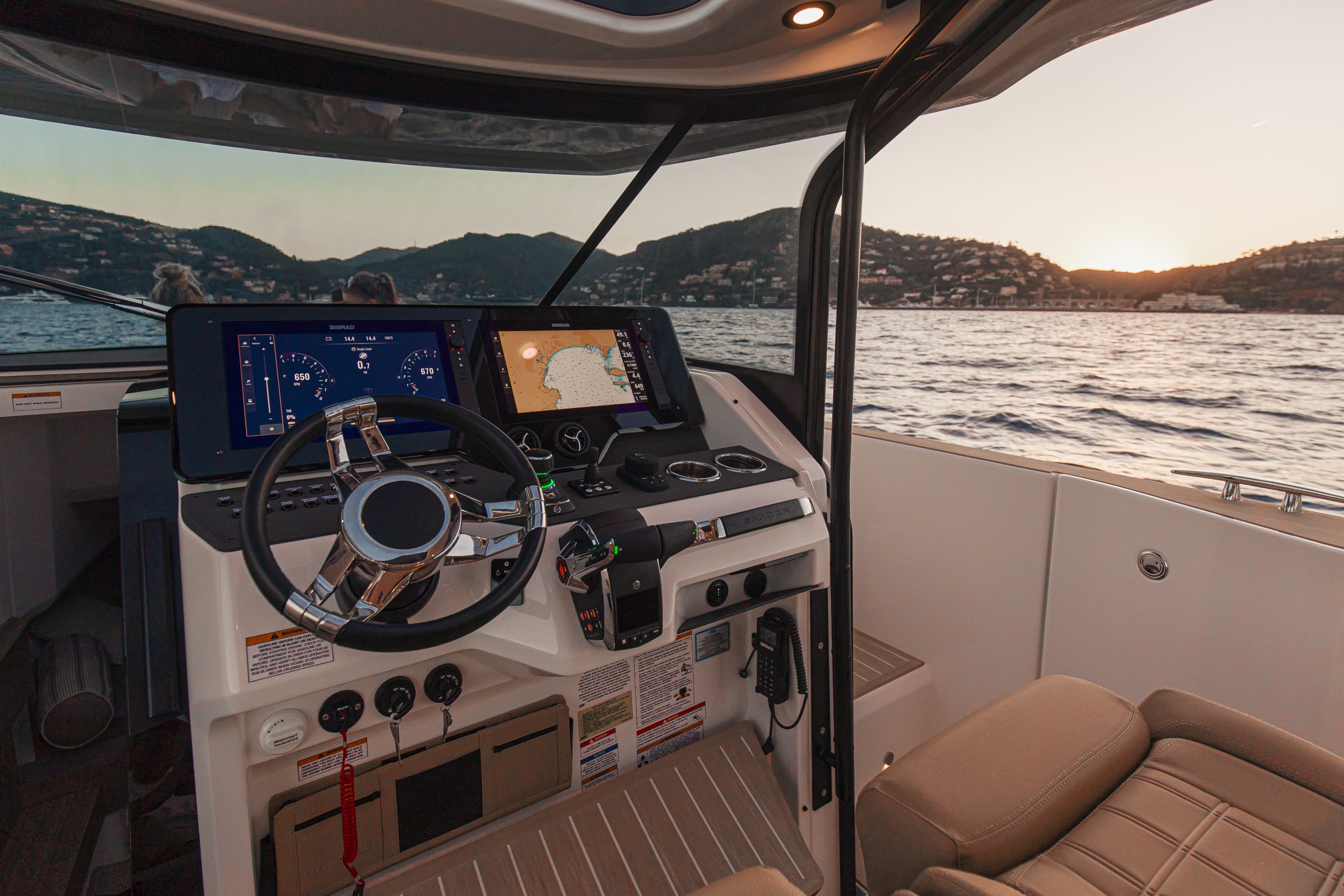 Aan het roer ervaar je direct waarom de 400 GTS een echte driver’s boat is. De ergonomische stuurpositie met brede zichtlijnen, comfortabele stoelen en intuïtieve bedieningselementen zorgt voor maximale controle en comfort, zelfs tijdens lange tochten. Het vernieuwde dashboard is overzichtelijk en modern, met zwevende dubbele displays en een minimalistisch design. De volledige voorruit sluit perfect aan op het dak en biedt uitstekende bescherming tegen wind en spray — zo blijf je gefocust op de koers, niet op de omstandigheden.