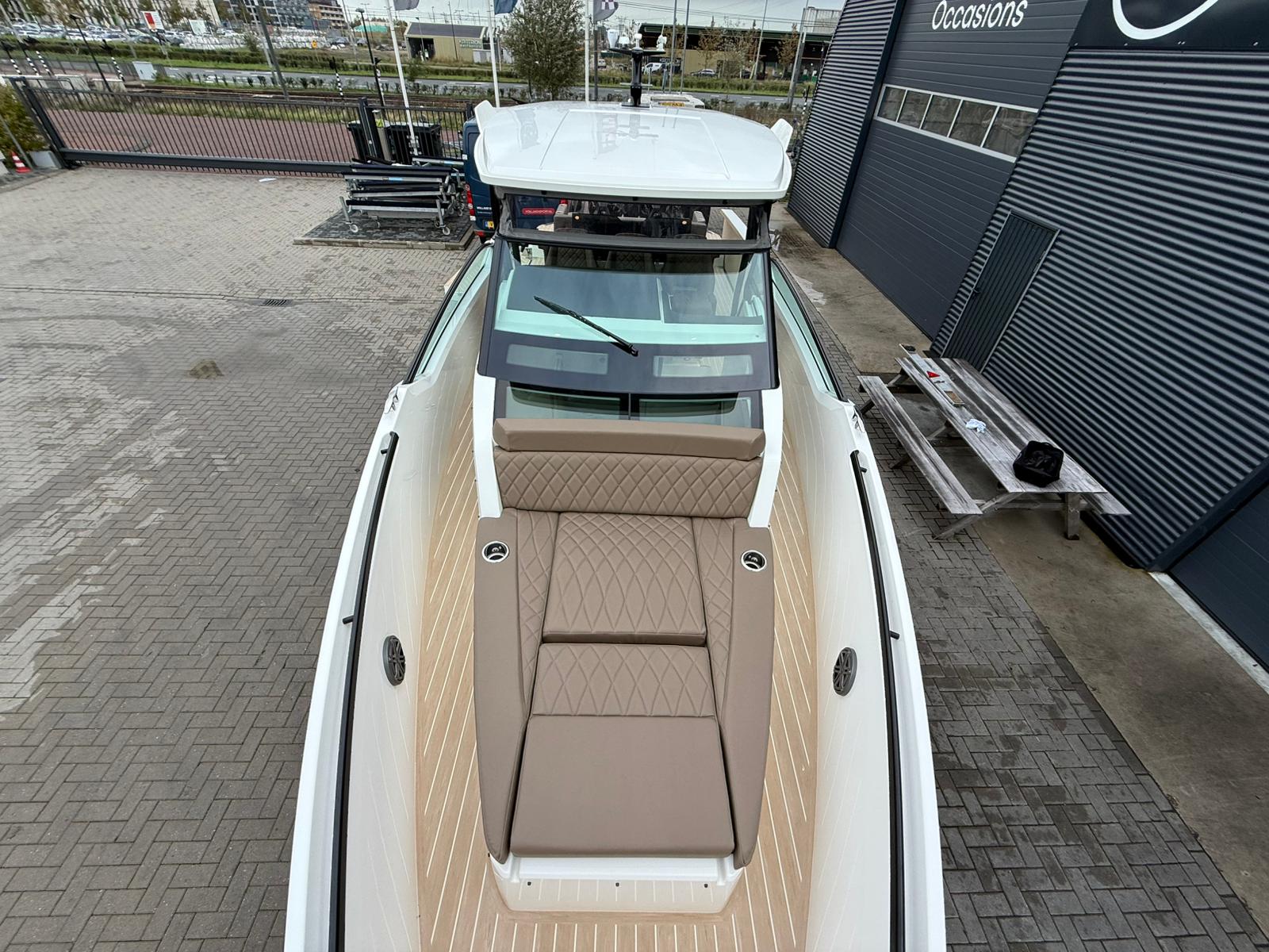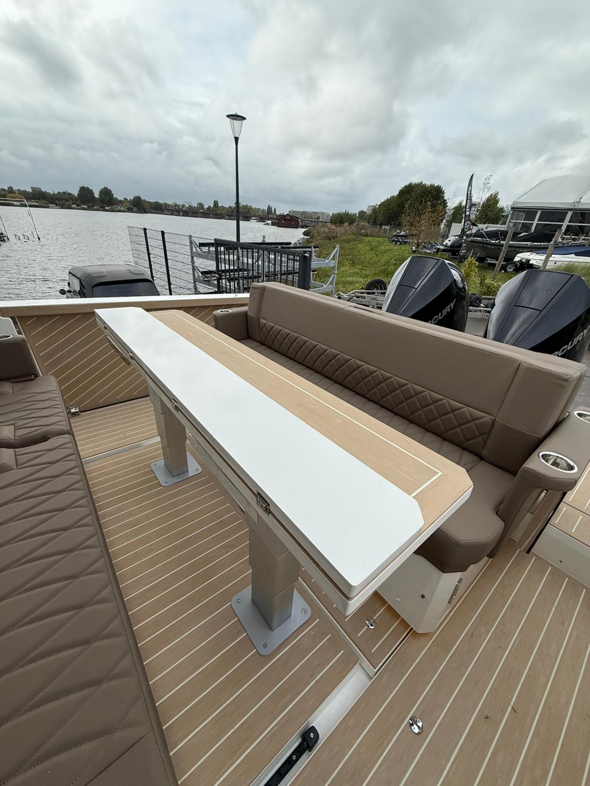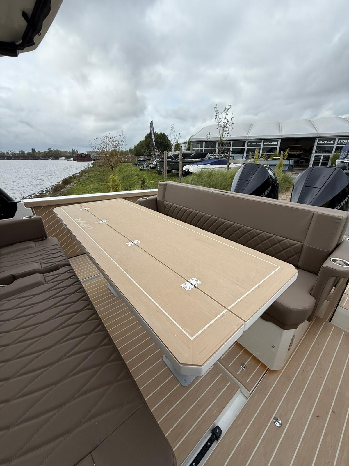 Aan boord straalt de 320 GTO pure verfijning uit. De witte romp met Nougat-kleurige bekleding en Flexiteek-vloer zorgen voor een warme, luxe sfeer, terwijl het doordachte ontwerp een optimale balans biedt tussen comfort en gebruiksgemak. De ruime kuip is voorzien van een sliding sofa met achterste zonnebed, zodat u eenvoudig kunt wisselen tussen loungen, dineren of zonnebaden. Op het voordek bevindt zich een groot sunbed met bekerhouders en bijpassende hoes – een perfecte plek om te ontspannen en te genieten van het uitzicht.