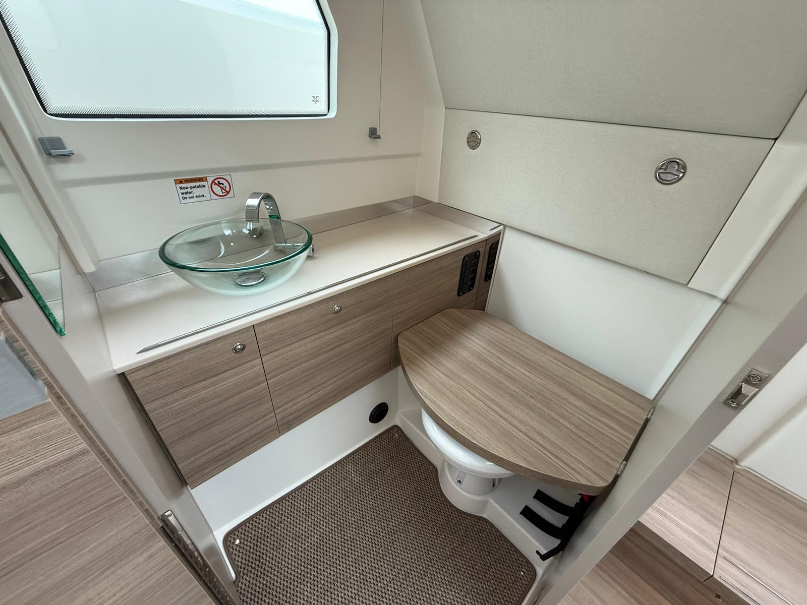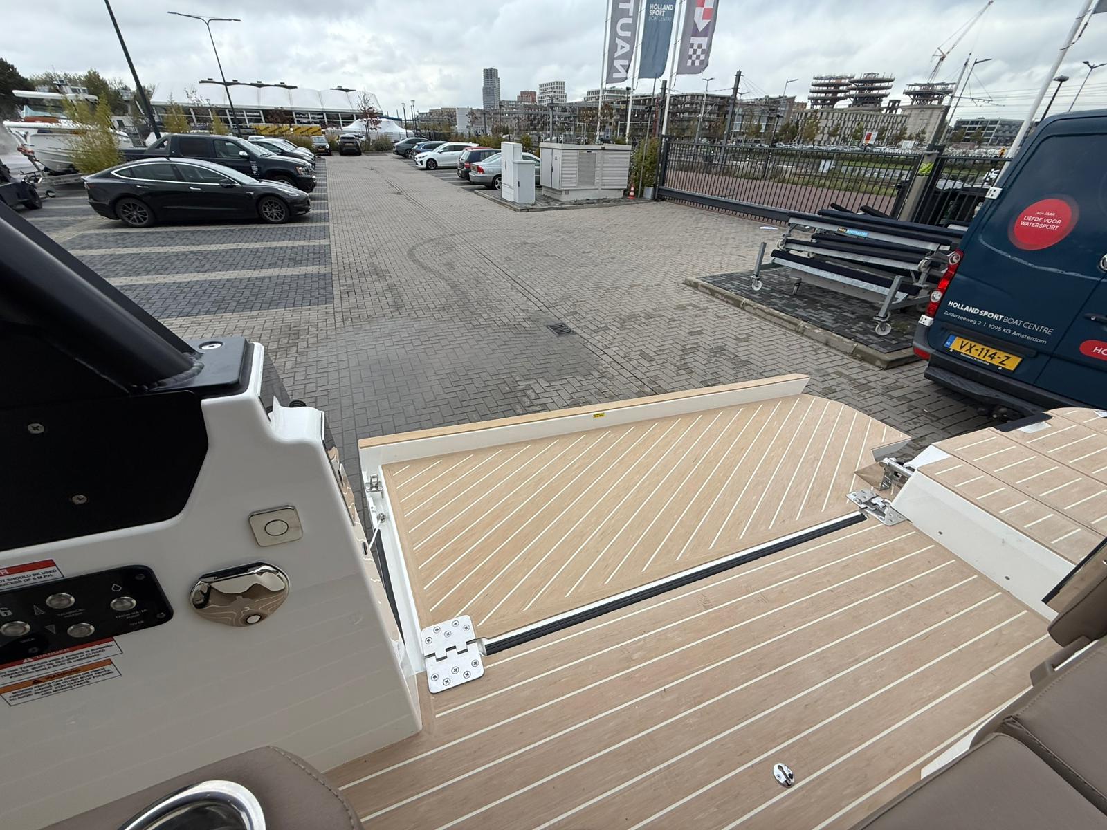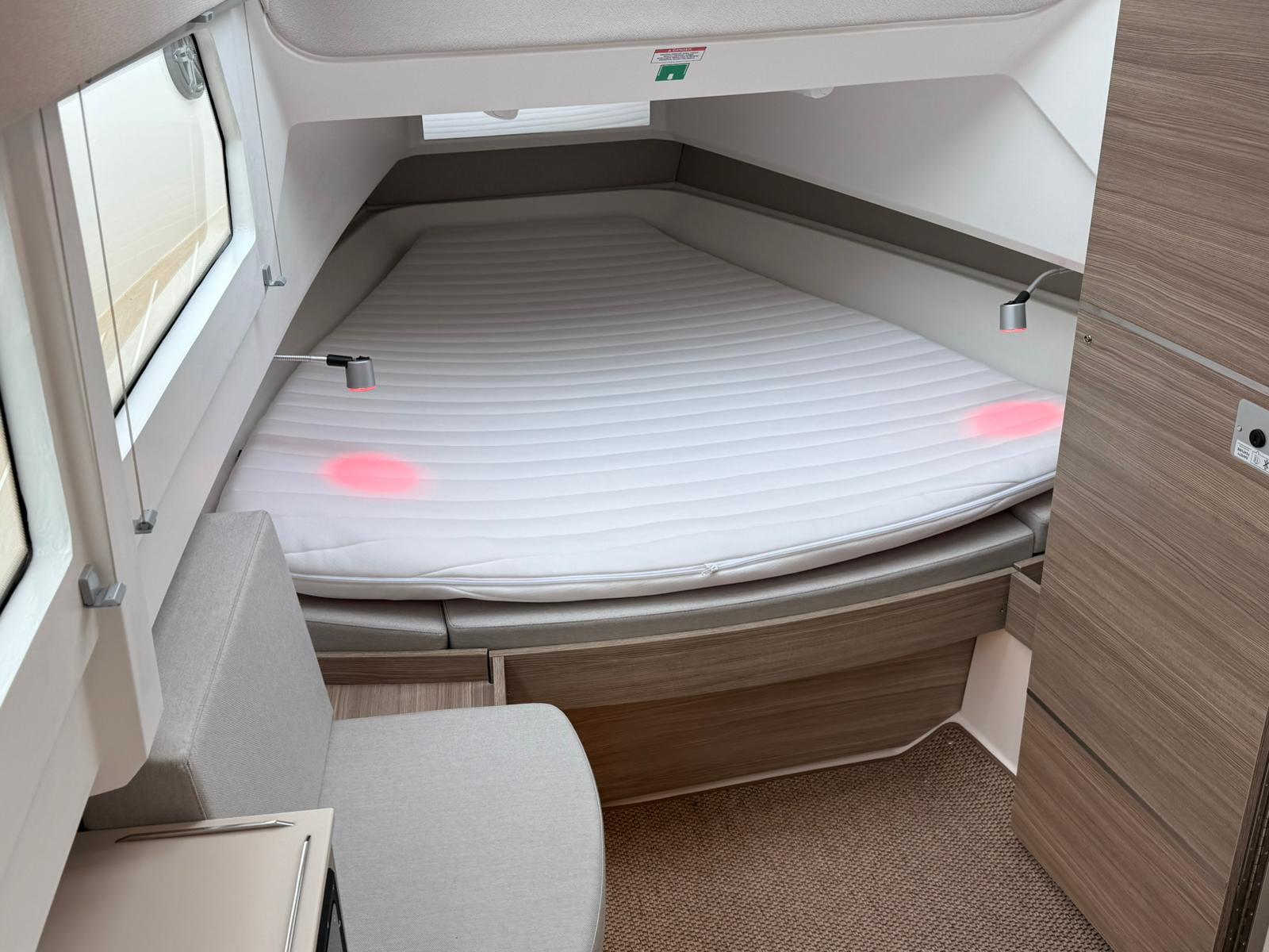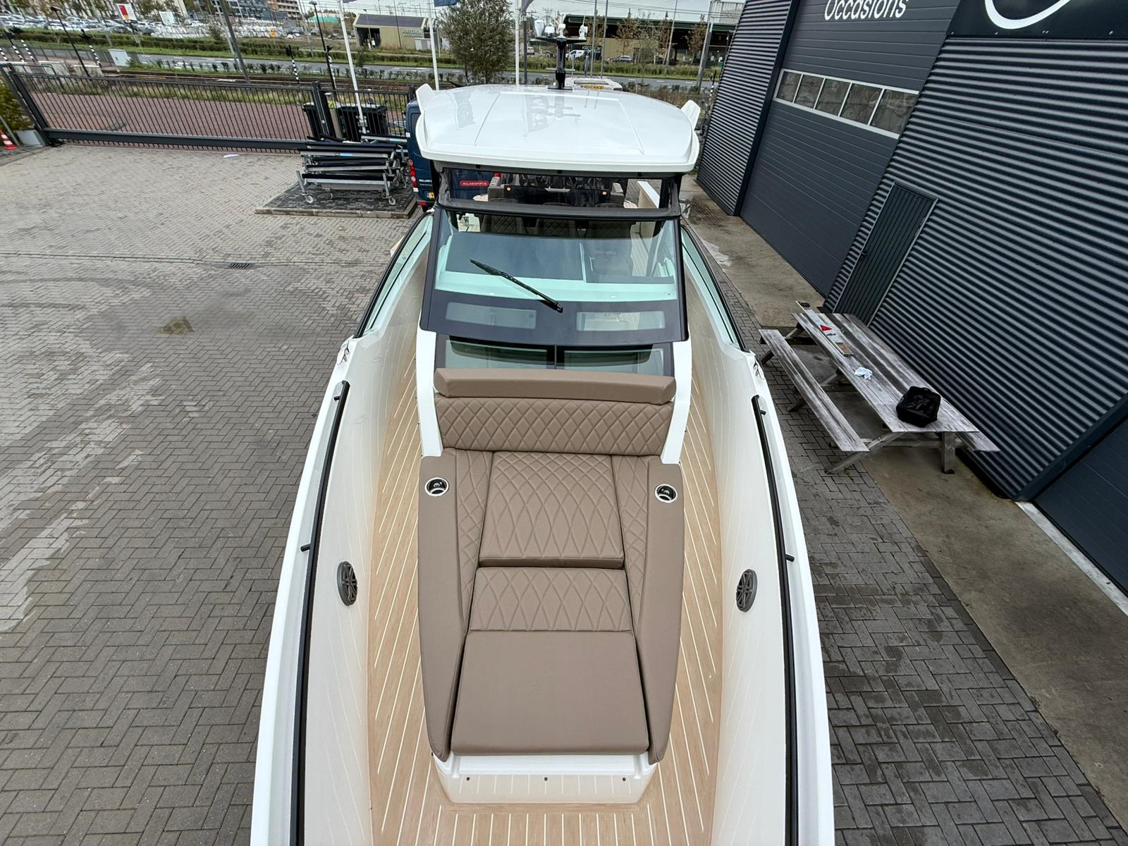 Aan boord straalt de 320 GTO pure verfijning uit. De witte romp met Nougat-kleurige bekleding en Flexiteek-vloer zorgen voor een warme, luxe sfeer, terwijl het doordachte ontwerp een optimale balans biedt tussen comfort en gebruiksgemak. De ruime kuip is voorzien van een sliding sofa met achterste zonnebed, zodat u eenvoudig kunt wisselen tussen loungen, dineren of zonnebaden. Op het voordek bevindt zich een groot sunbed met bekerhouders en bijpassende hoes – een perfecte plek om te ontspannen en te genieten van het uitzicht.