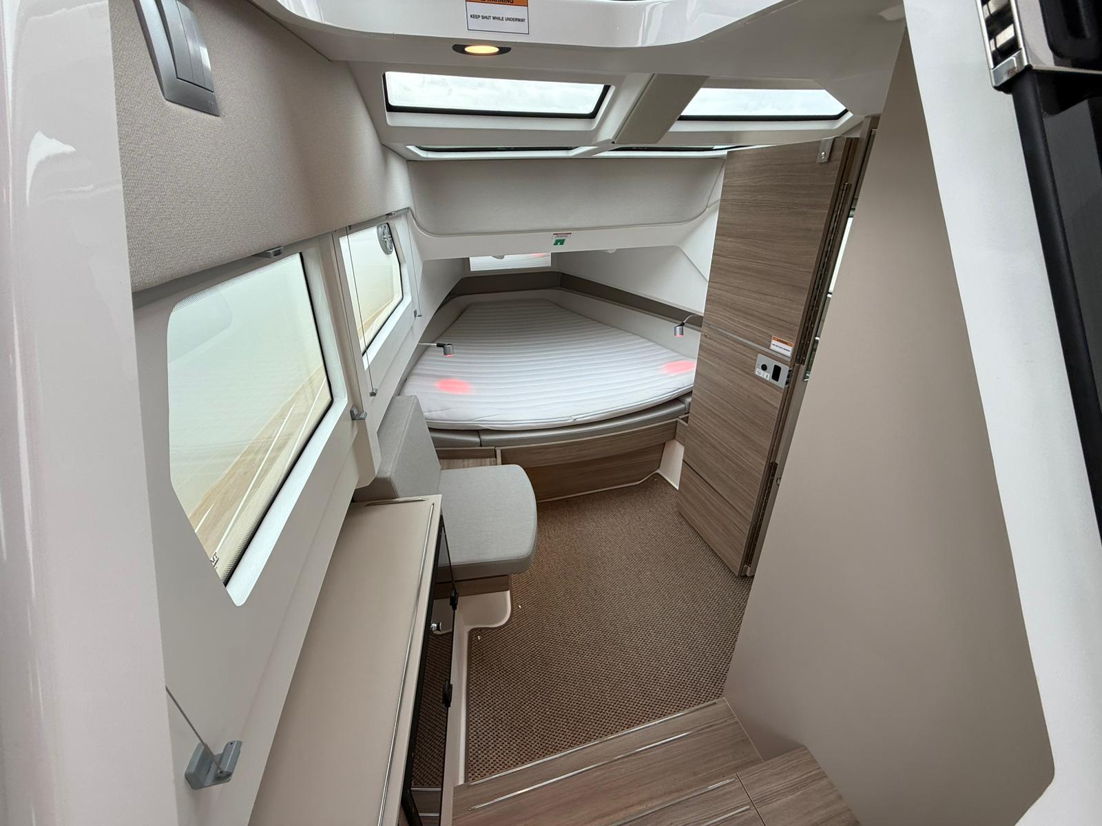 De binnenruimte is ontworpen voor ontspanning en overnachting. De volwaardige cabine biedt comfortabele slaapplaatsen voor twee personen, ideaal voor een weekend op het water. Het Cold Climate Package zorgt ervoor dat u het hele seizoen door kunt varen, ongeacht de temperatuur.