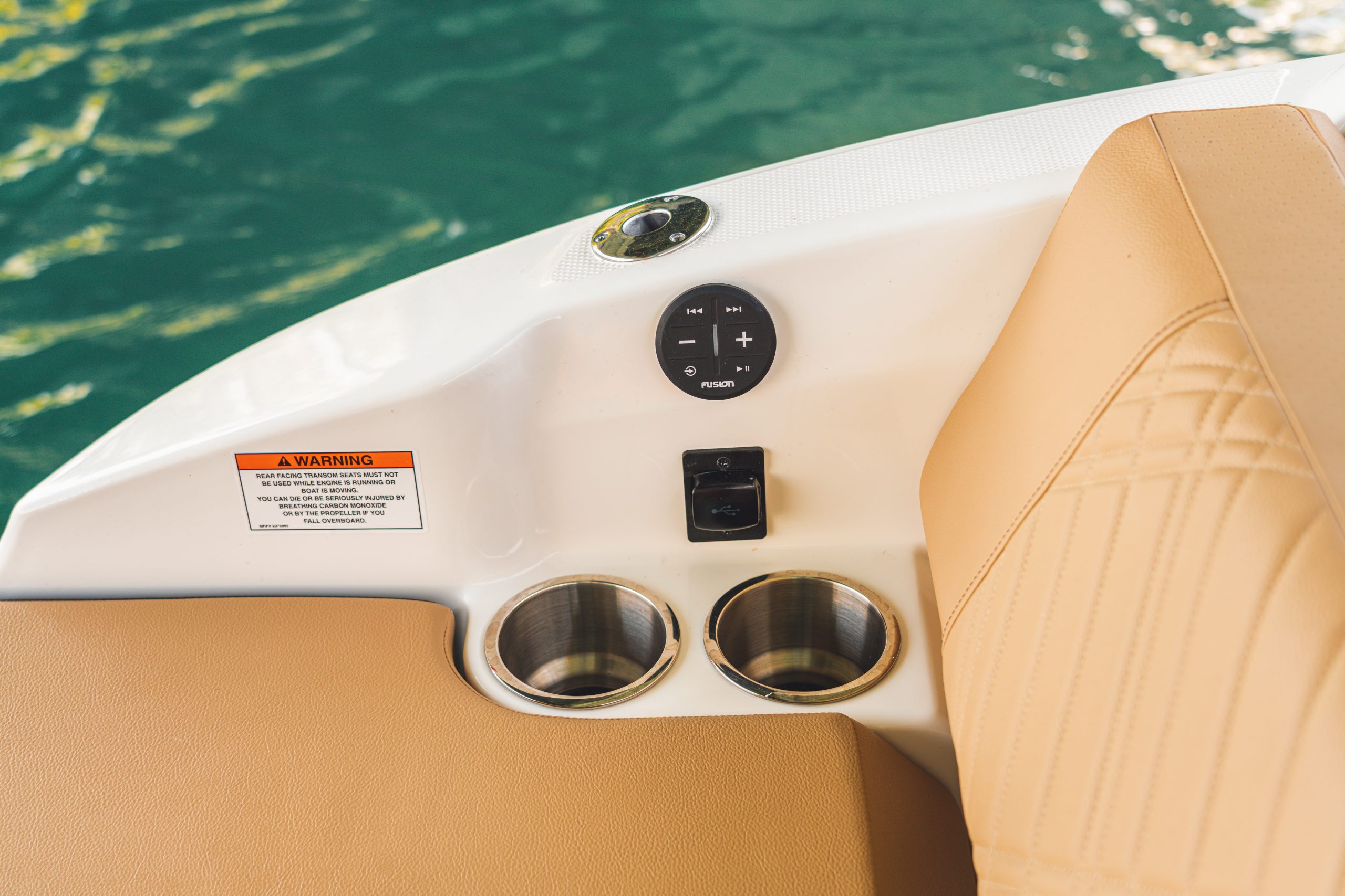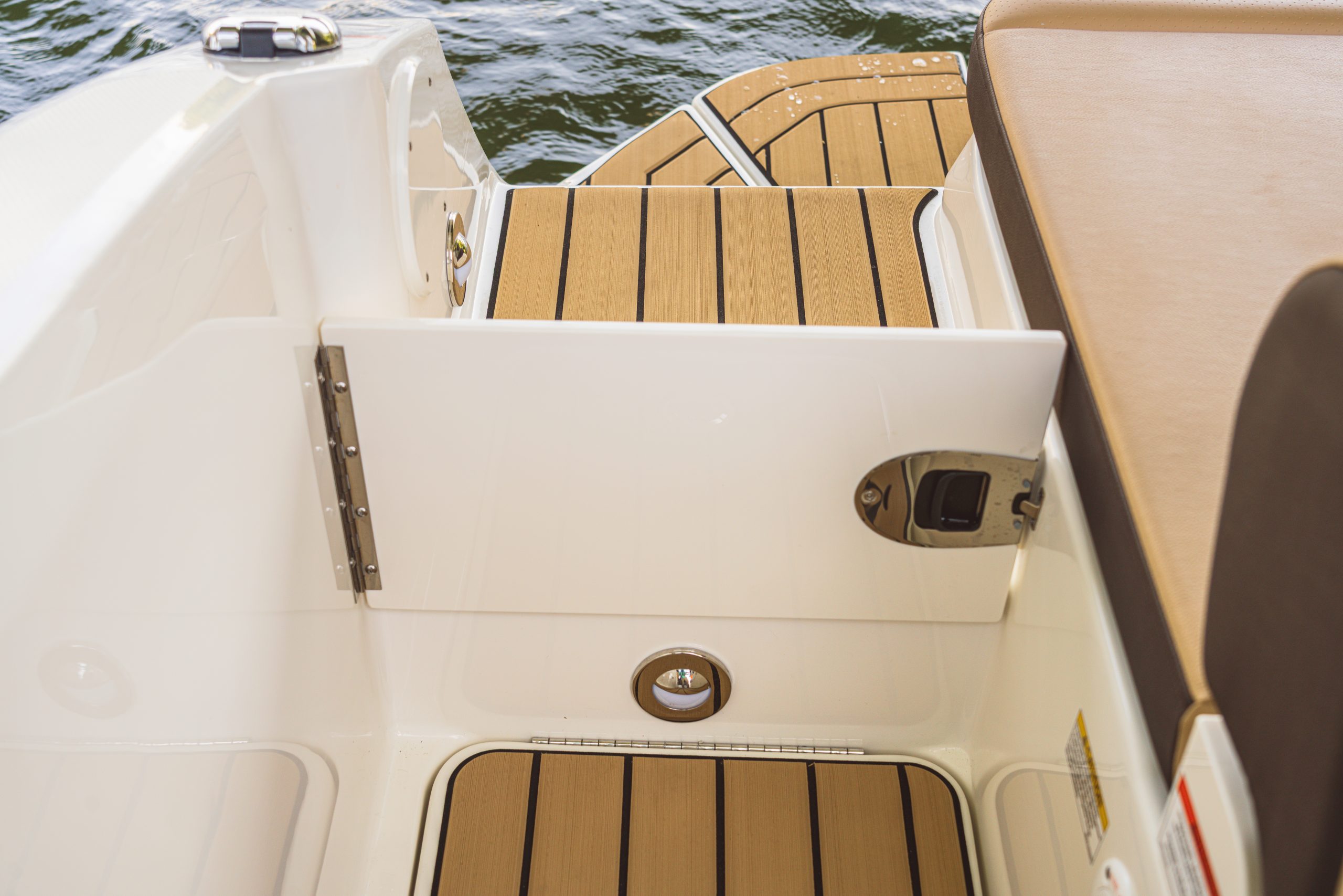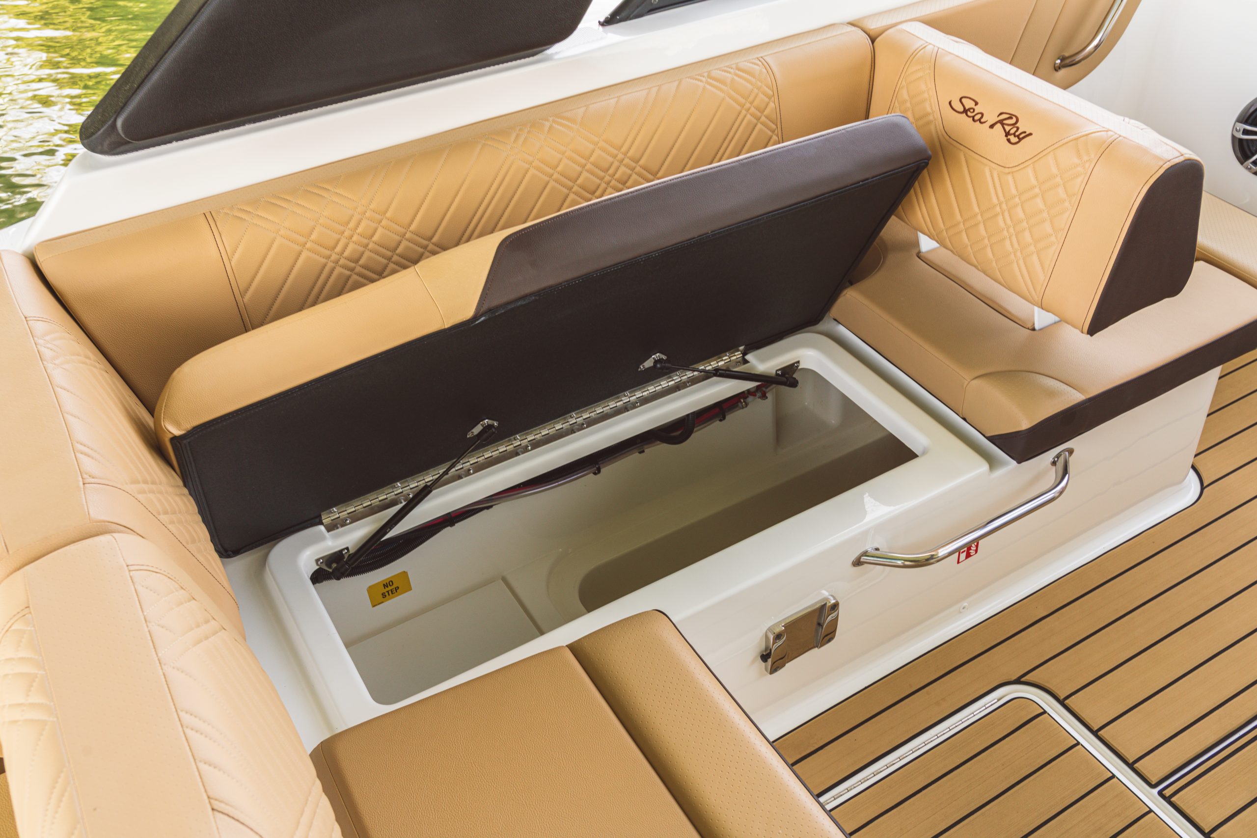 - Integrated cooler or storage, fiberglass with drain (under bow seating)