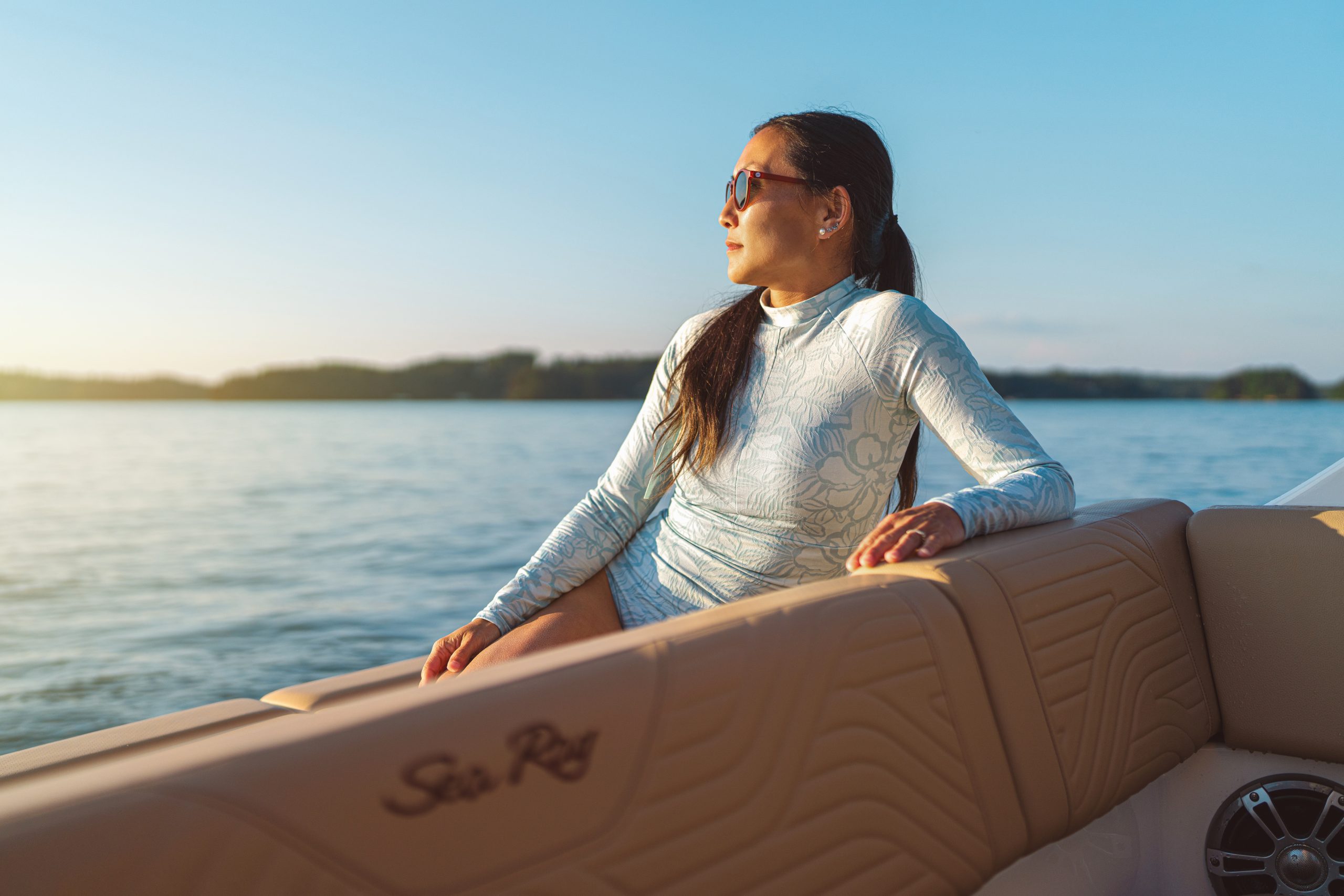 De grote zwemplatform met optionele automatische onderwatertrap maakt het eenvoudig om in en uit het water te stappen. De achterbank is verstelbaar in drie standen en verandert moeiteloos in een comfortabele, naar achteren gerichte zonnebank – ideaal om de actie op het water te volgen.