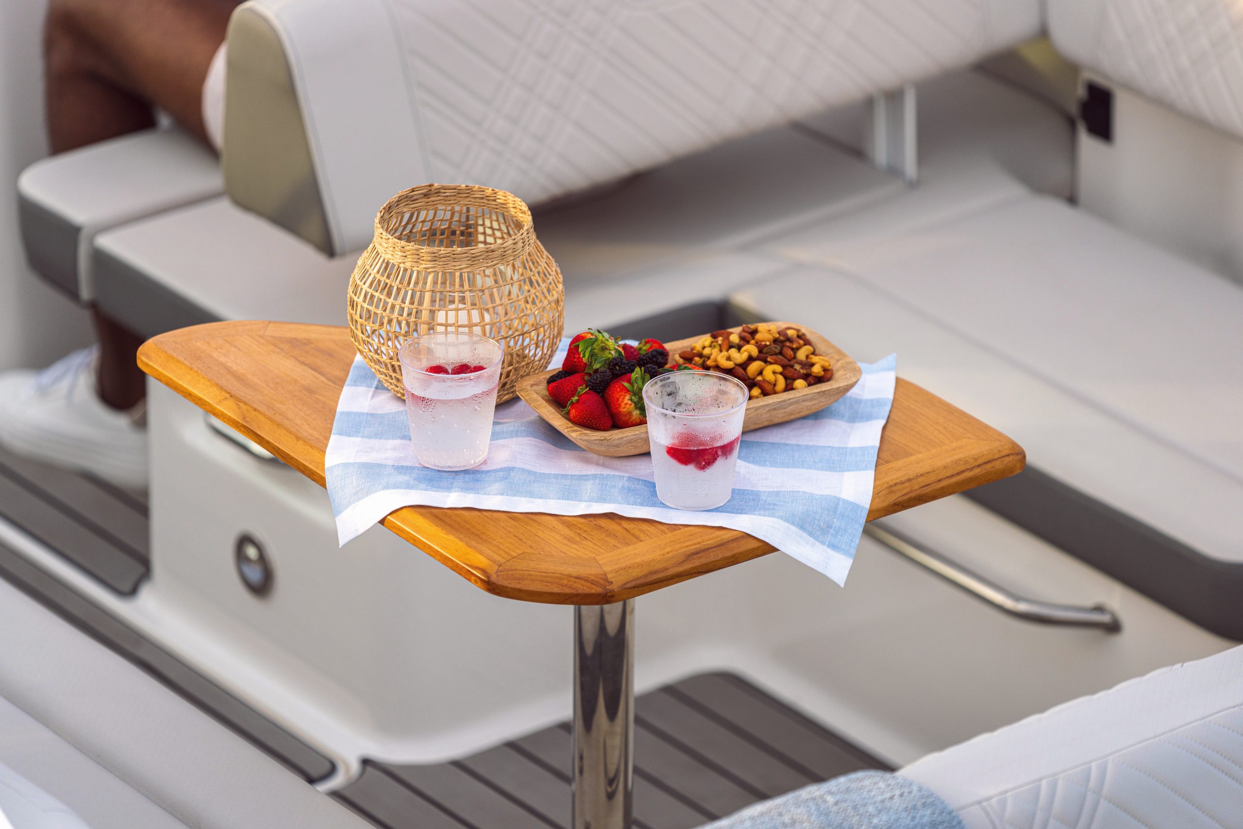 Aan boord draait alles om ruimte, comfort en gebruiksgemak. De royale boeg biedt lounge-stijl zitplaatsen, een geïntegreerde koelruimte voor drankjes en snacks, en een standaard boegladder voor makkelijke toegang vanaf de voorzijde. Met het optionele Comfort Pakket voeg je een elegante teaktafel en opvulkussen toe, waarmee de boeg verandert in een extra relaxruimte.
