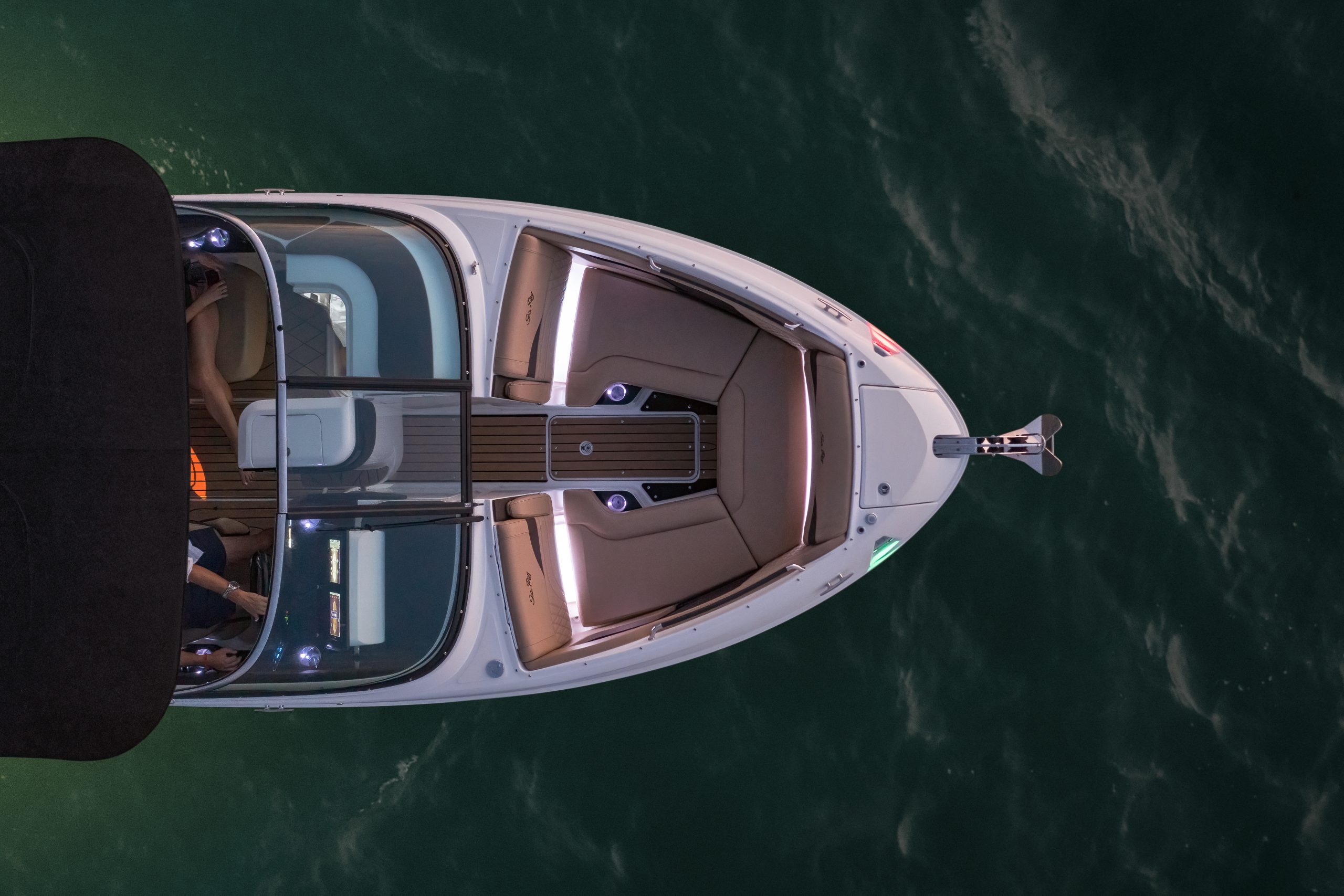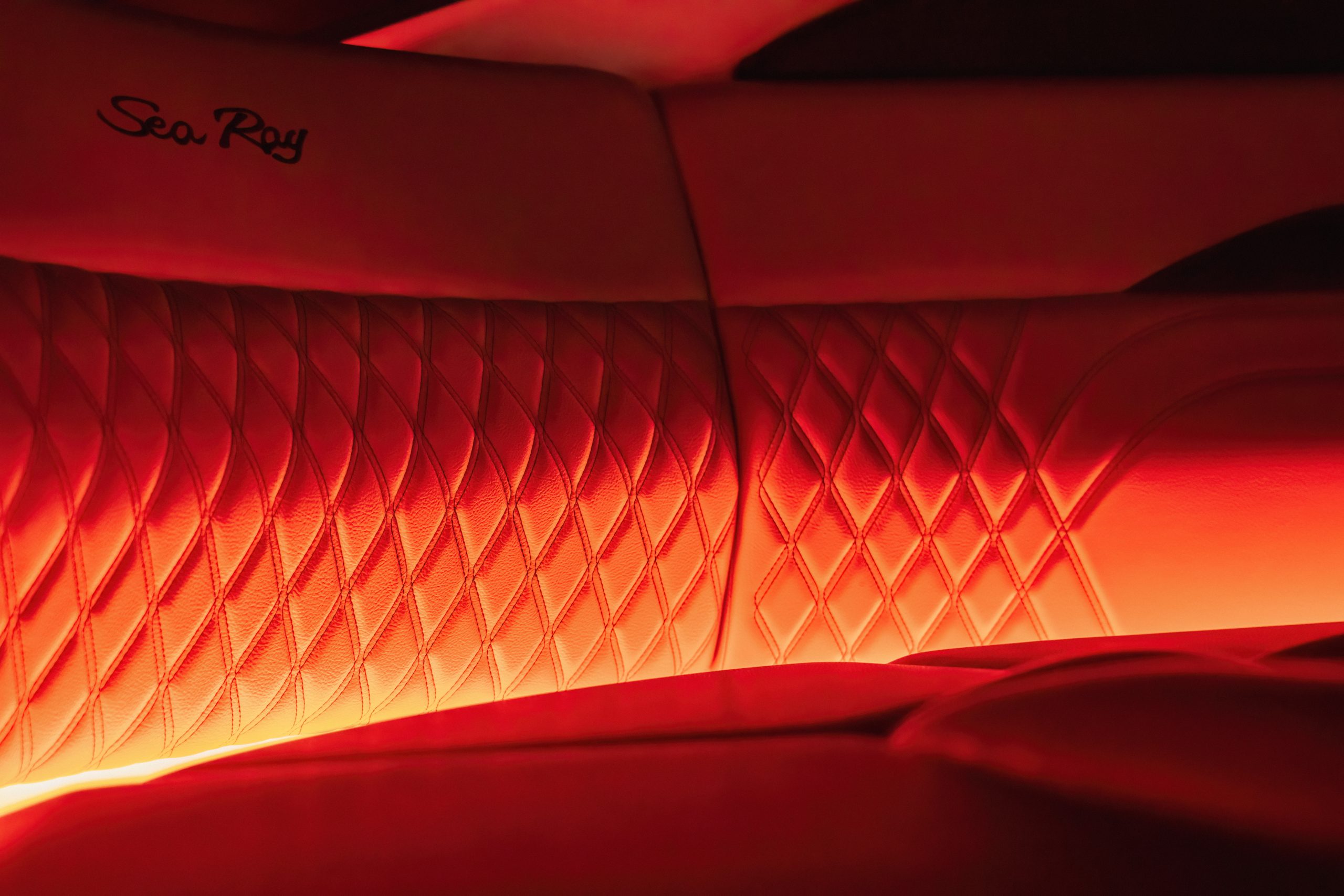 Achterop nodigt het uitgebreide zonnedek uit tot ultieme ontspanning. Of je nu geniet van een zonnige dag aan het water of tot rust komt tijdens een avondcruise – hier ervaar je het echte Sea Ray-gevoel: comfort, ruimte en verfijning. Voor nog meer sfeer is de SLX 260 uit te breiden met het verlichte LED RGB-W verlichtingspakket, waarmee je met één druk op de knop de juiste ambiance creëert, van zacht wit tot levendige kleuren.