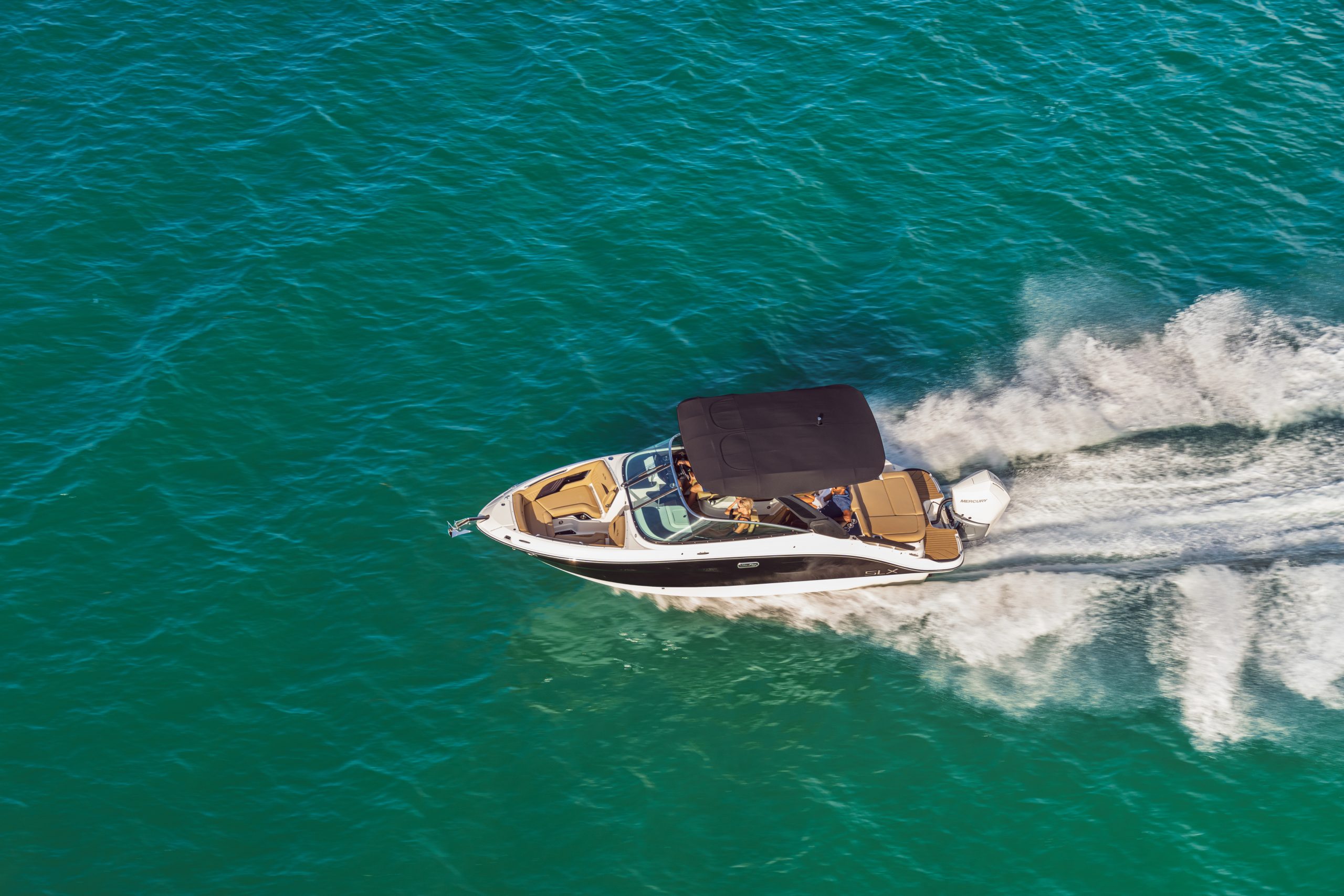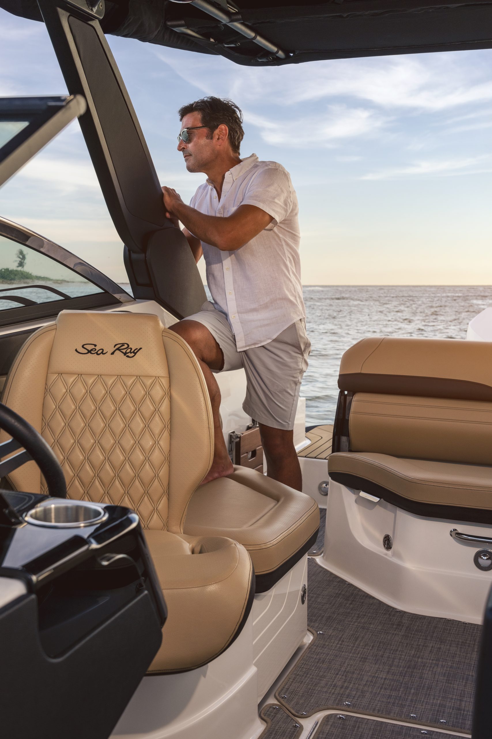 Met de optionele Power Tower voegt Sea Ray nog meer functionaliteit toe: deze elektrisch bedienbare toren klapt met één druk op de knop op of neer en biedt extra schaduw aan de achterzijde of over de boeg.
