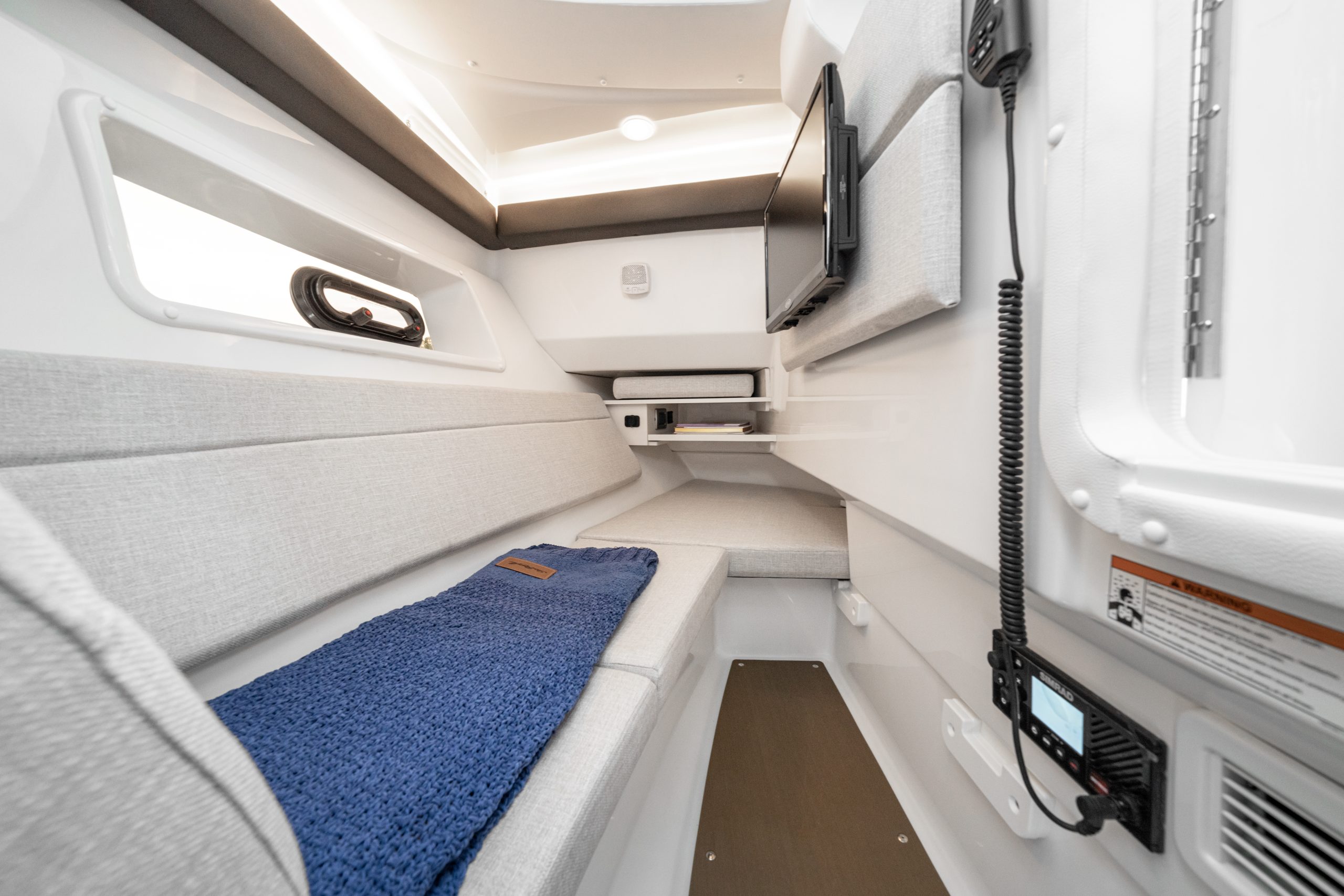 Uniek aan de SLX 350 is de slimme en comfortabele Port Hideaway® – een luxueuze, met airconditioning uitgeruste privéruimte in de romp van de boot. Met zachte kussens, SeaDek-vloerbekleding, een tv en aansluitingen voor media is dit de perfecte plek om even te ontsnappen aan de zon of je dag op het water moeiteloos te verlengen. Een onverwacht ruim toevluchtsoord dat perfect past bij het gezinsvriendelijke karakter van deze boot.
