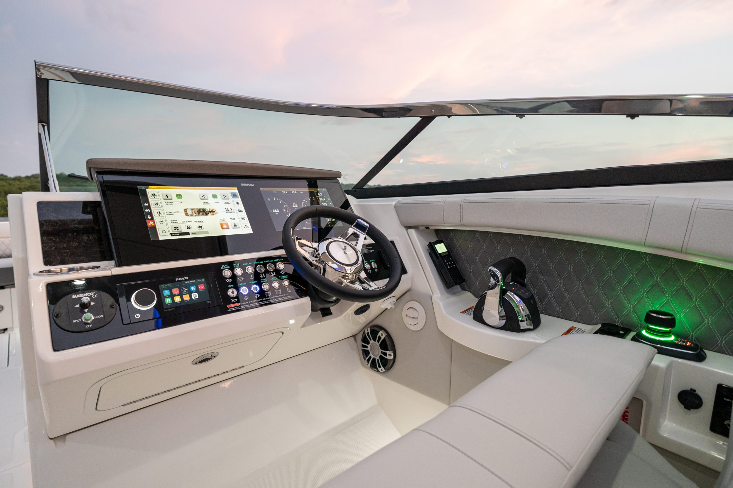 De stuurstand is uitgerust met een intuïtief systeem dat direct vertrouwen wekt. Twee 9-inch Simrad® Glass Dash-touchscreens geven toegang tot alle essentiële informatie, van navigatie tot motordata via Mercury VesselView® Link. Liever nog groter? Dan kies je gewoon voor het optionele 12-inch display – volledig afgestemd op jouw wensen en vaarstijl.