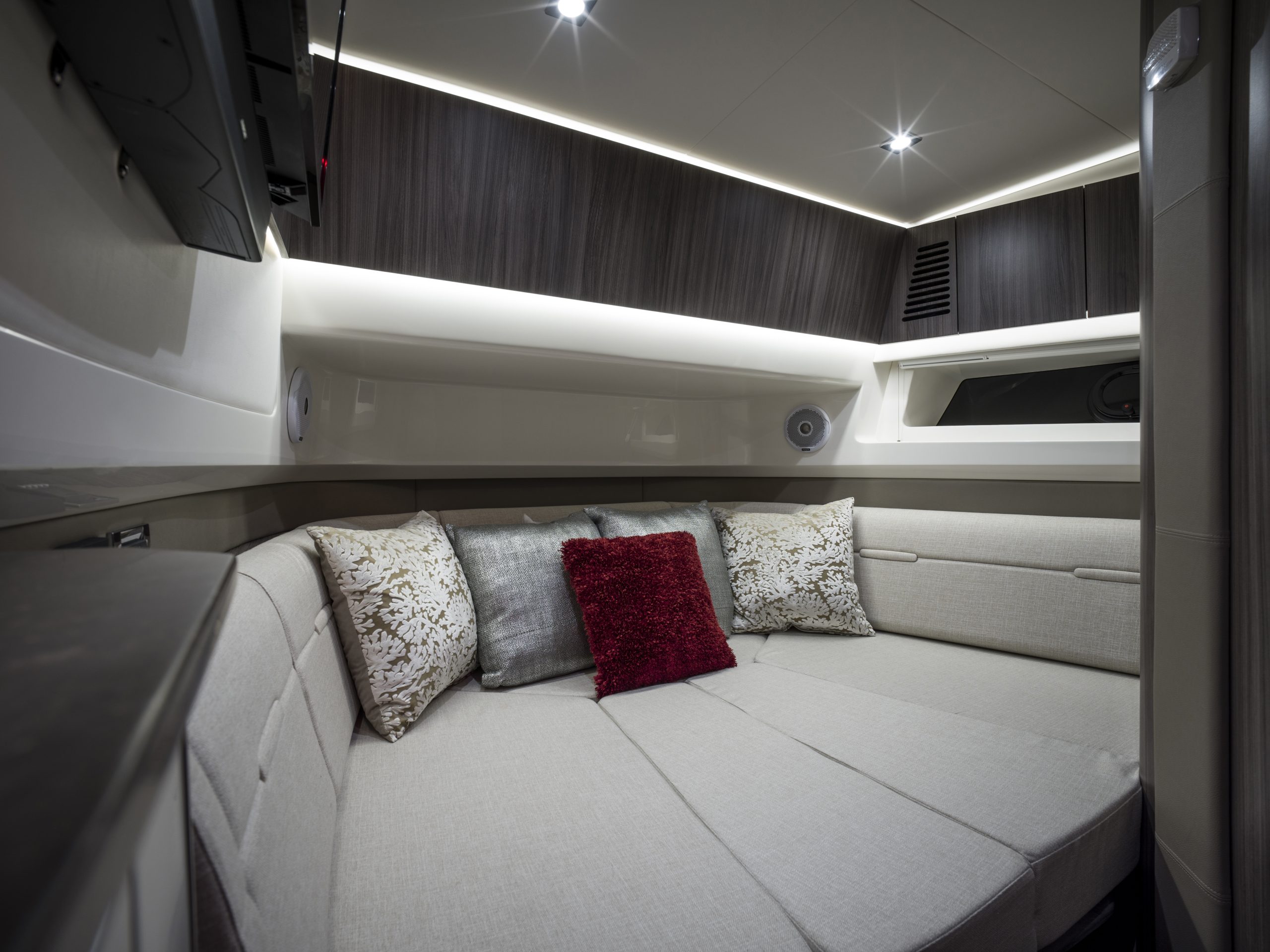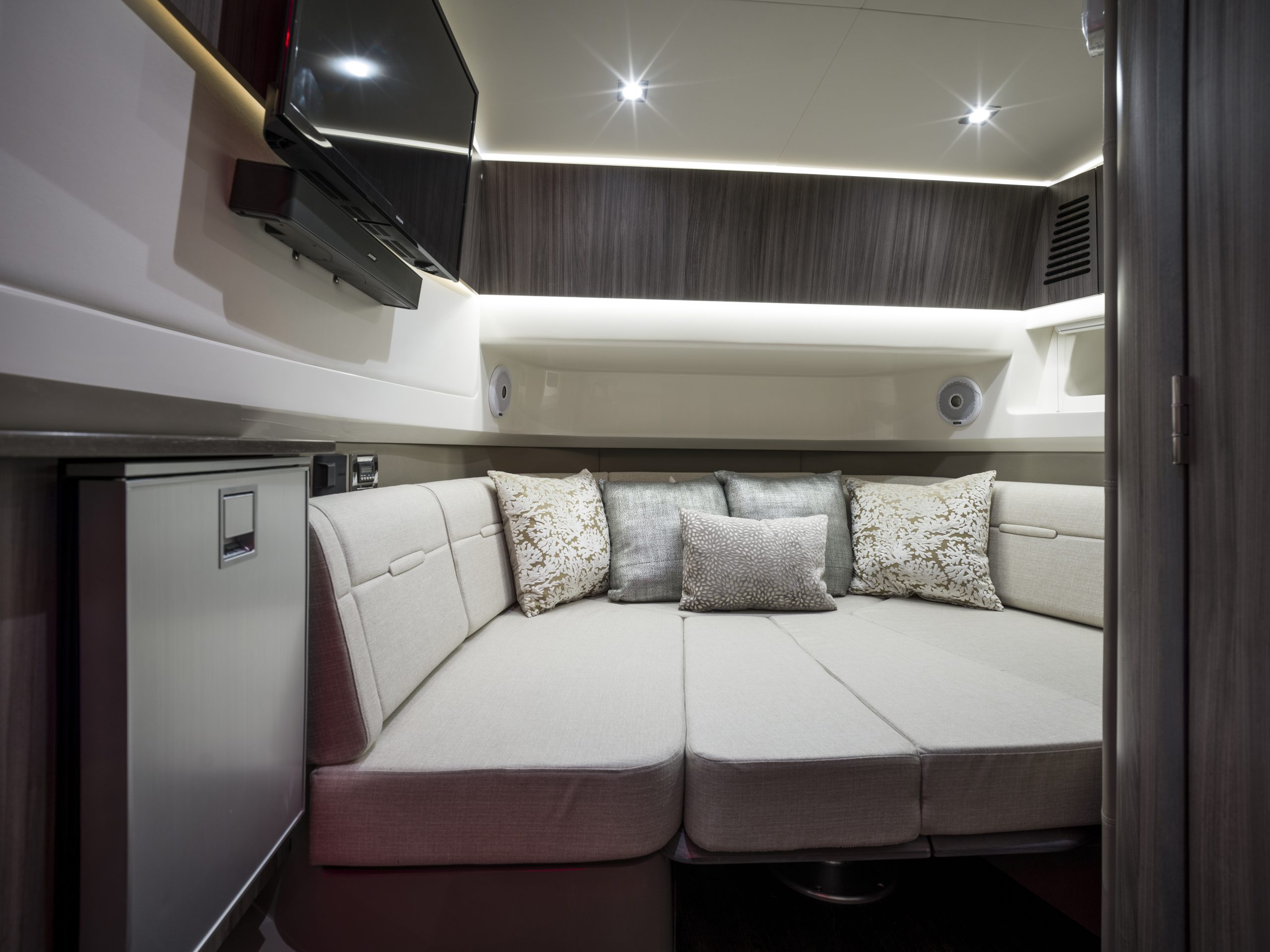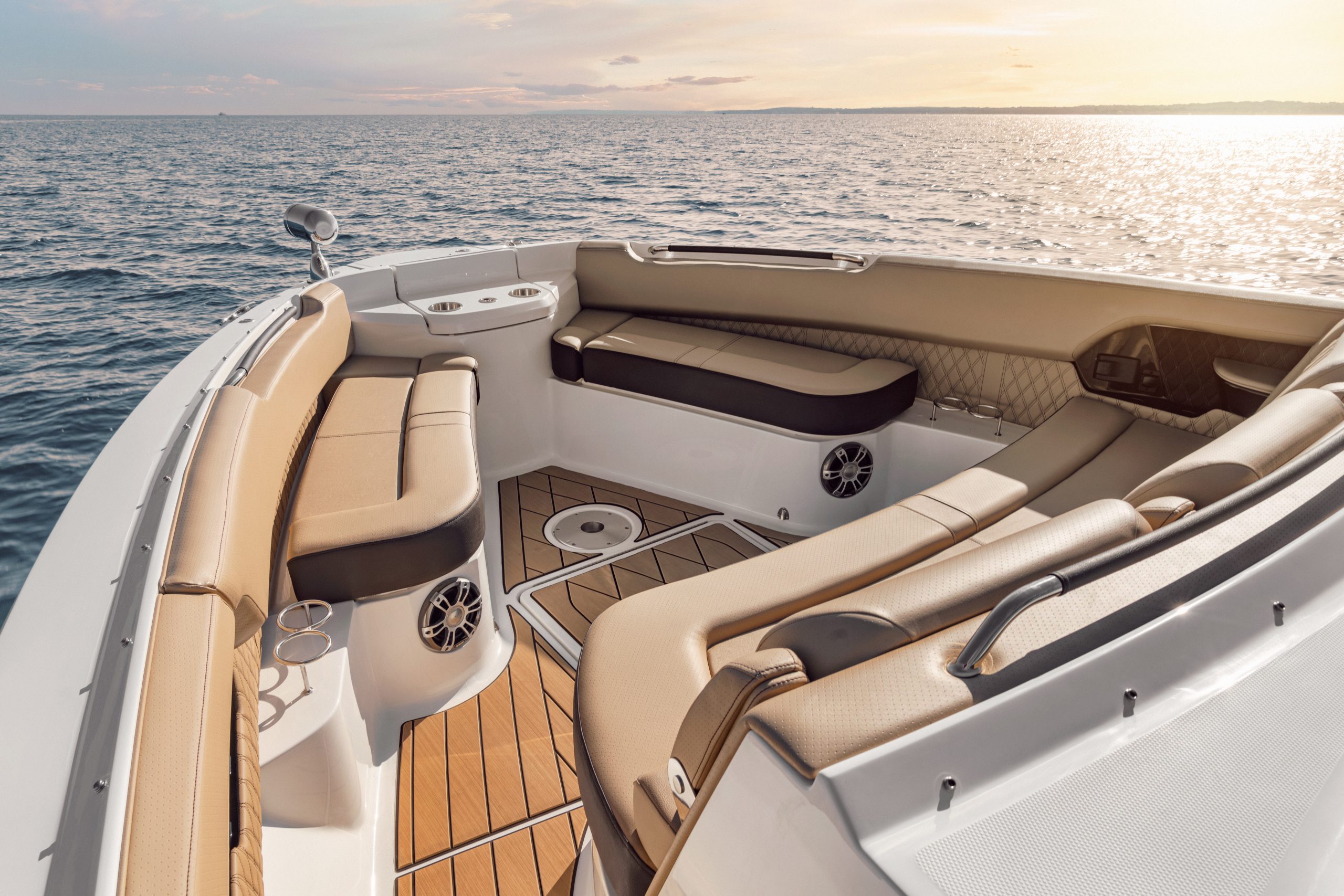 Dankzij de Yacht Certified-capaciteit biedt de boot ruimte aan iedereen die je wilt meenemen. Het boeggedeelte is voorzien van luxe touring seats met armleuningen en een converteerbare tafel, terwijl het zwemplatform, de cockpit en het interieur naadloos in elkaar overlopen. Elk detail, van zitcomfort tot technologie, is ontworpen om jouw dag op het water onvergetelijk te maken.