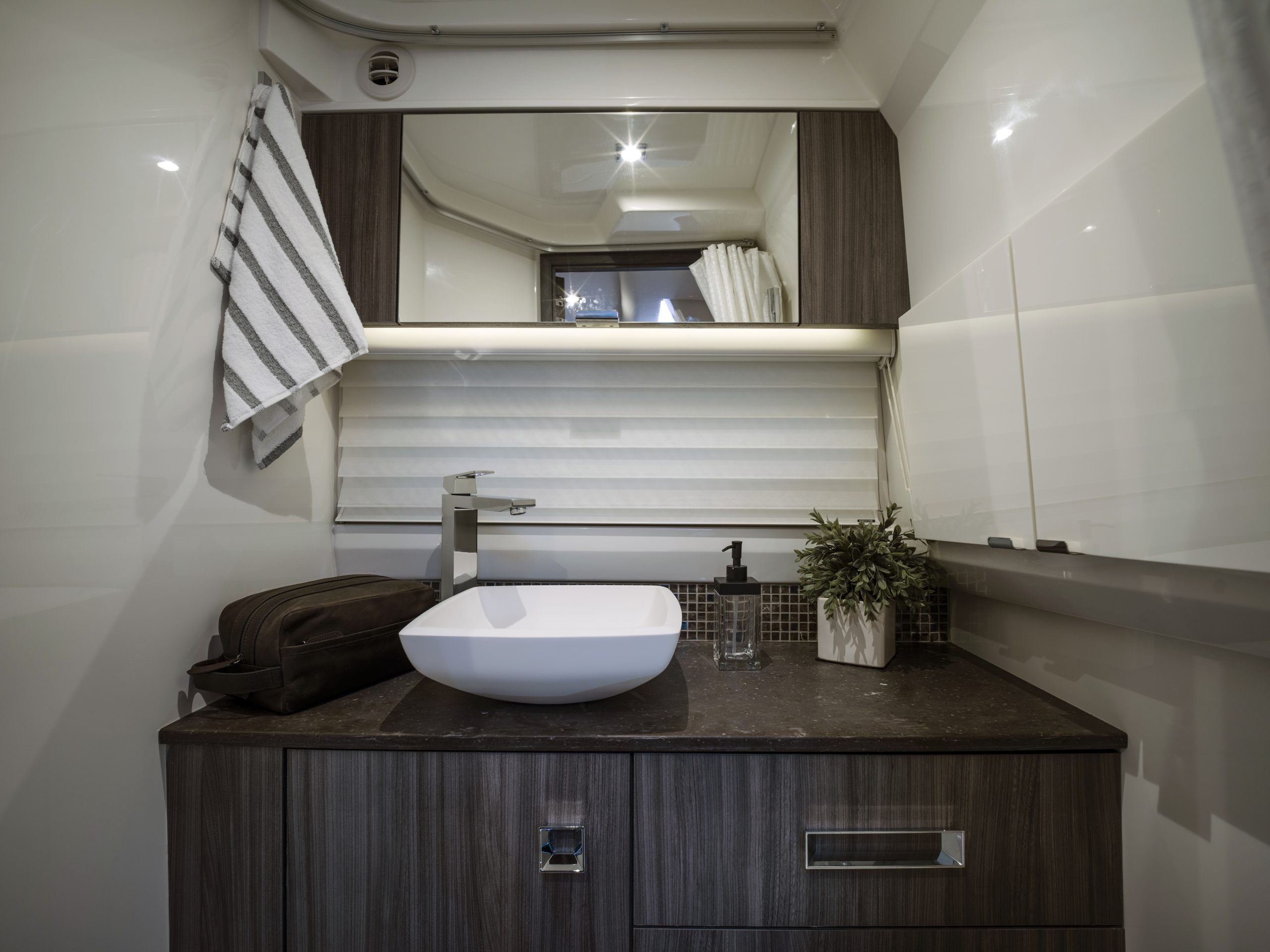 Binnenin wacht een verrassend ruime en luxe uitgeruste cabine. De voorste dinette kan eenvoudig worden omgevormd tot een gezellige slaapplaats, en achterin vind je een queen-size bed voor comfortabele overnachtingen. De afwerking is warm en modern, de sfeer uitnodigend. Deze boot is niet alleen ontworpen voor dagtochten – hij nodigt uit om langer te blijven.
