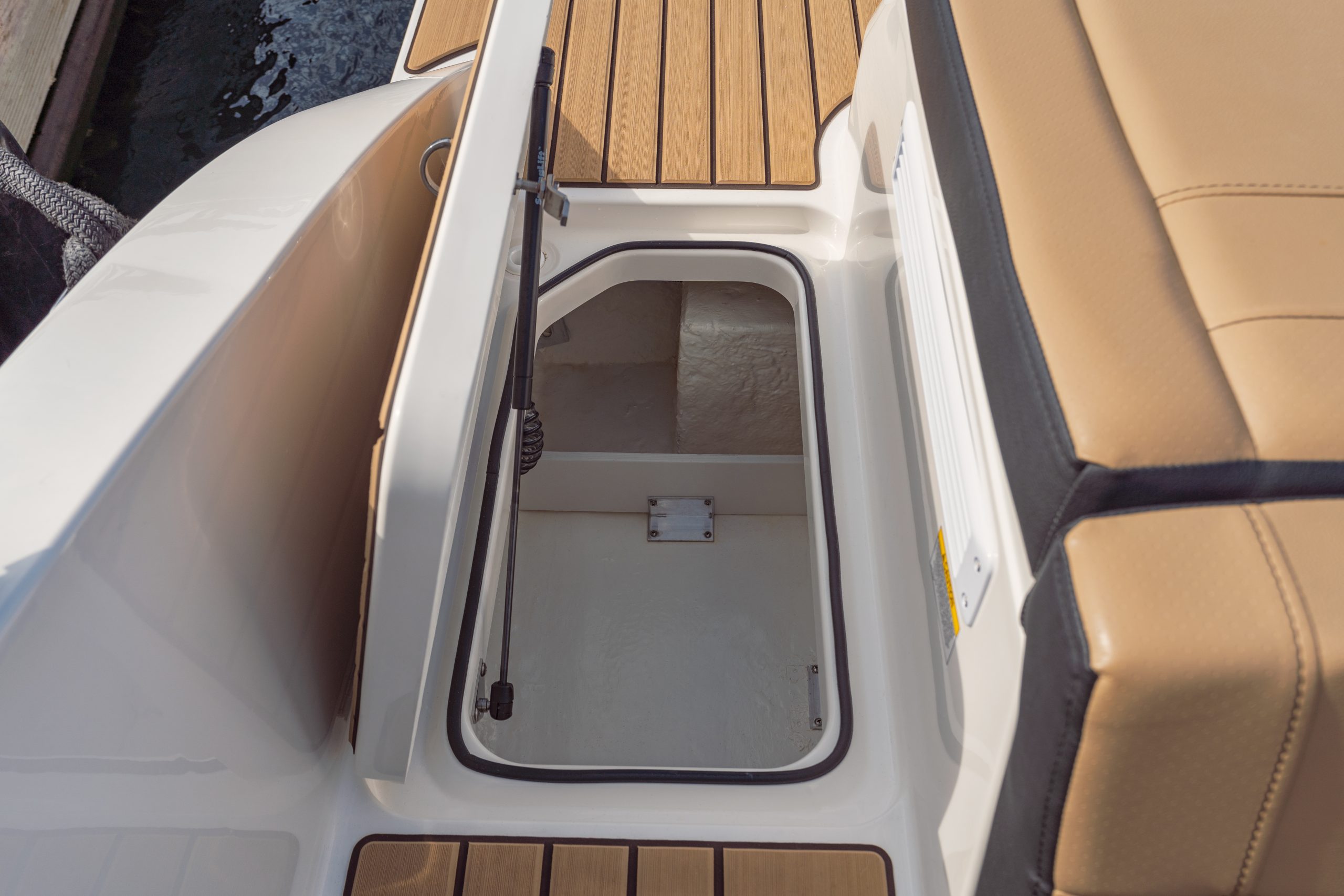 • Transom storage for gear with gas-assisted fiberglass lid (under sunpad)
