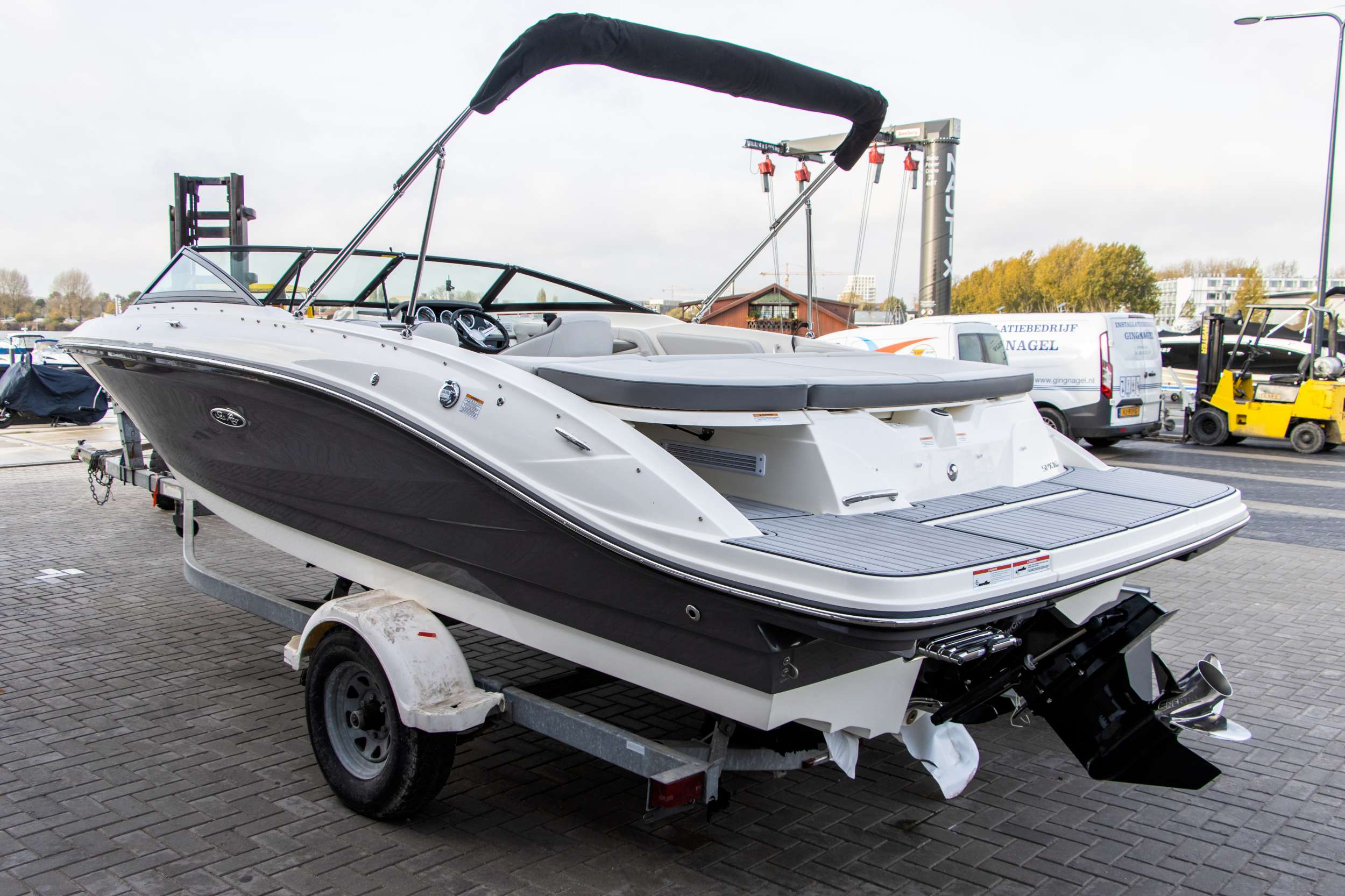 Het interieur is uitgevoerd met SeaDek vloerbekleding in grijs, zowel in de cockpit als op het ruime zwemplateau. Dit biedt niet alleen een moderne uitstraling, maar ook extra grip en comfort onder de voeten. De 12V koelkast in de cockpit houdt drankjes heerlijk koel, terwijl de blauwe LED-verlichting in de kuip zorgt voor een sfeervolle ambiance tijdens avondvaarten. Praktische details zoals de fender clips maken aanleggen eenvoudig en stijlvol, terwijl het royale zwemplateau met geïntegreerde ladder uitnodigt tot een verfrissende duik of ontspannen momenten aan het water.