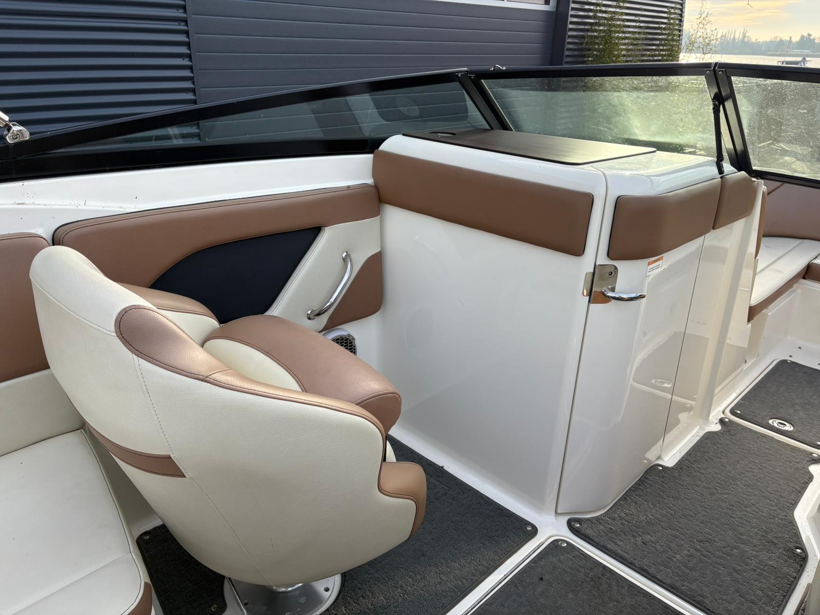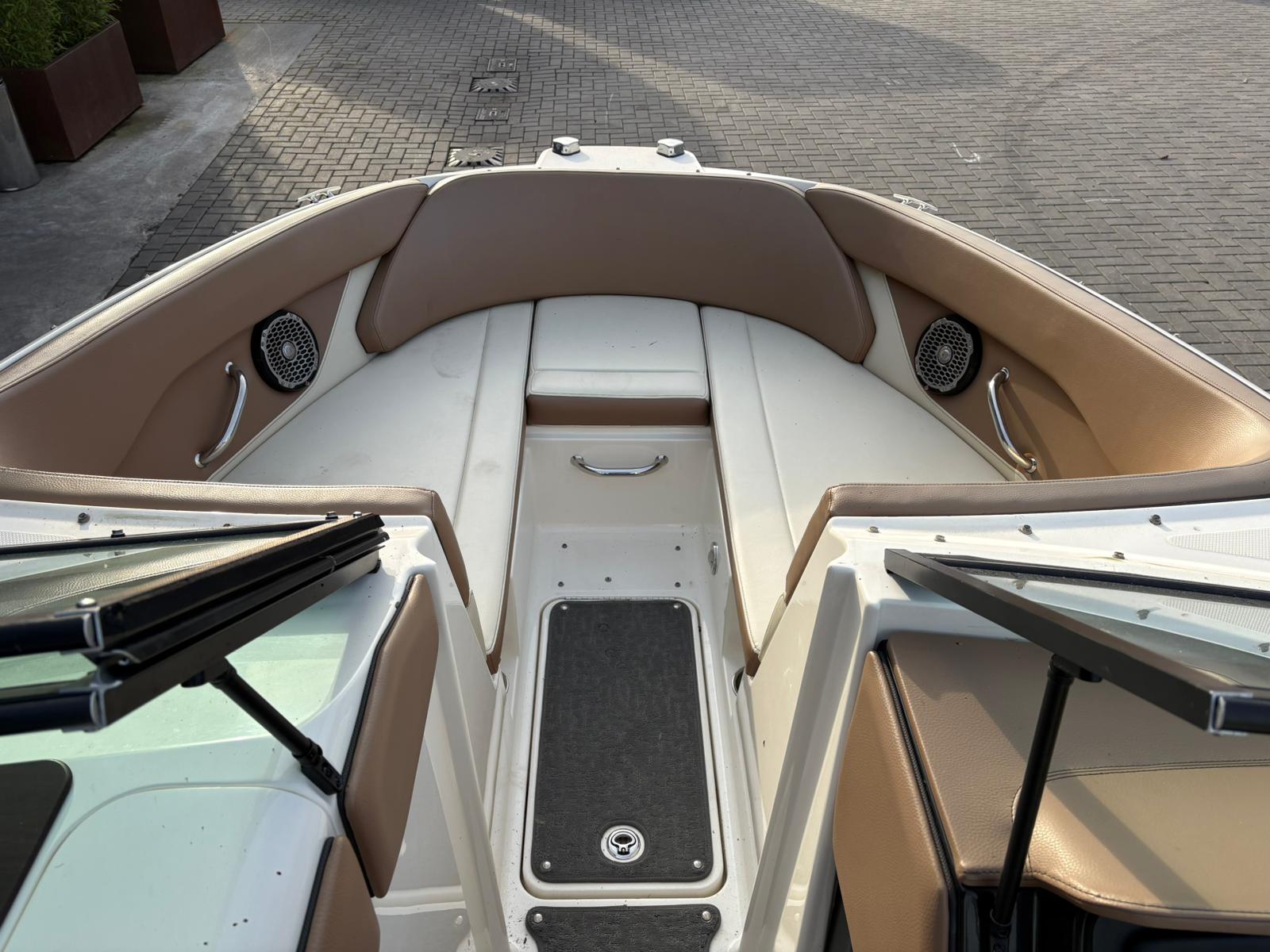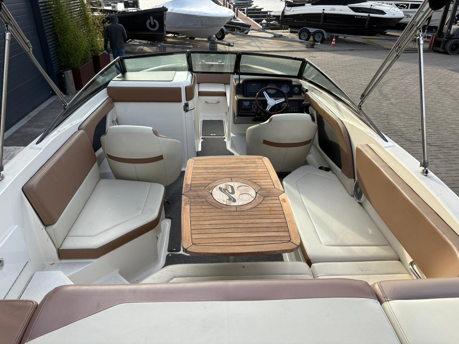 De indeling is speels en doordacht: een royale L-vormige lounge met zonnedek en handige doorloopopties, twee comfortabele kuipstoelen met flip-up delen, en een ruime boeg met luxe kussenset. De hoogwaardige Bella Grana bekleding geeft de boot een premium uitstraling en past perfect bij het strakke design.