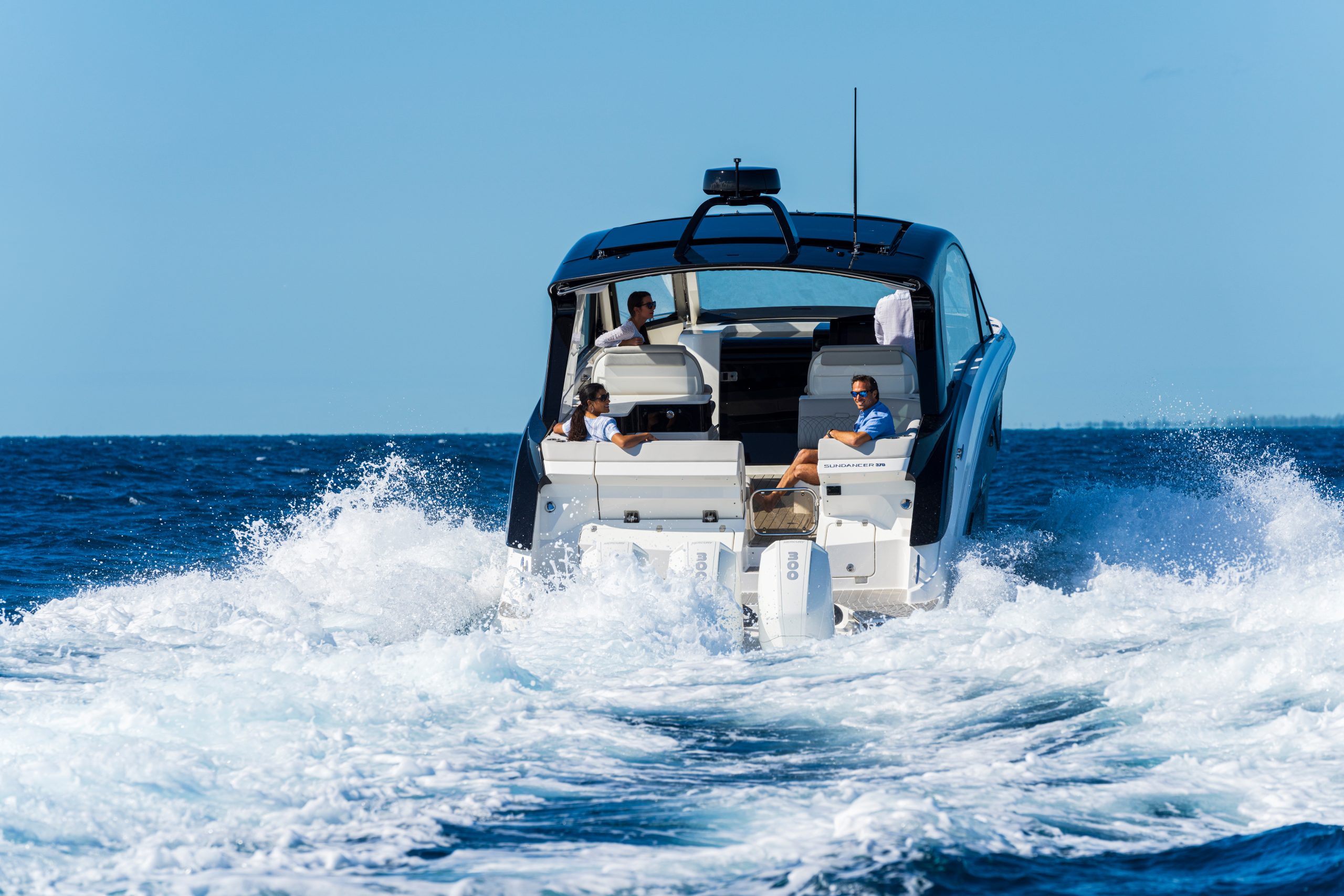 Voor wie nog meer bescherming en stijl zoekt, is er ook een Coupe-uitvoering van de Sundancer 370 Outboard. Deze variant biedt een hardtop met elektrisch bedienbare ramen, een panoramisch voorraam en een elektrisch schuifdak. Zo geniet je van licht en lucht wanneer jij dat wilt – met behoud van beschutting en klasse.